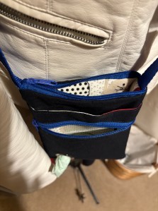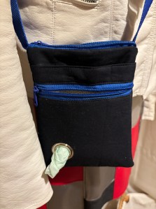 This Clover Convertible, designed by Blue Calla, was custom-made for a client’s birthday. She chose stonewashed black denim, high gloss black mock-croc faux leather, and purple accents. This lining is black cotton with cats printed in white – which is reversed for the pocket linings. It can be either a backpack or a cross-body, depending on your requirements, and has pockets inside and out. The base even unzips to reveal a ‘train case’! The straps are fully adjustable, and the flap fastens with a ‘thumb lock’.