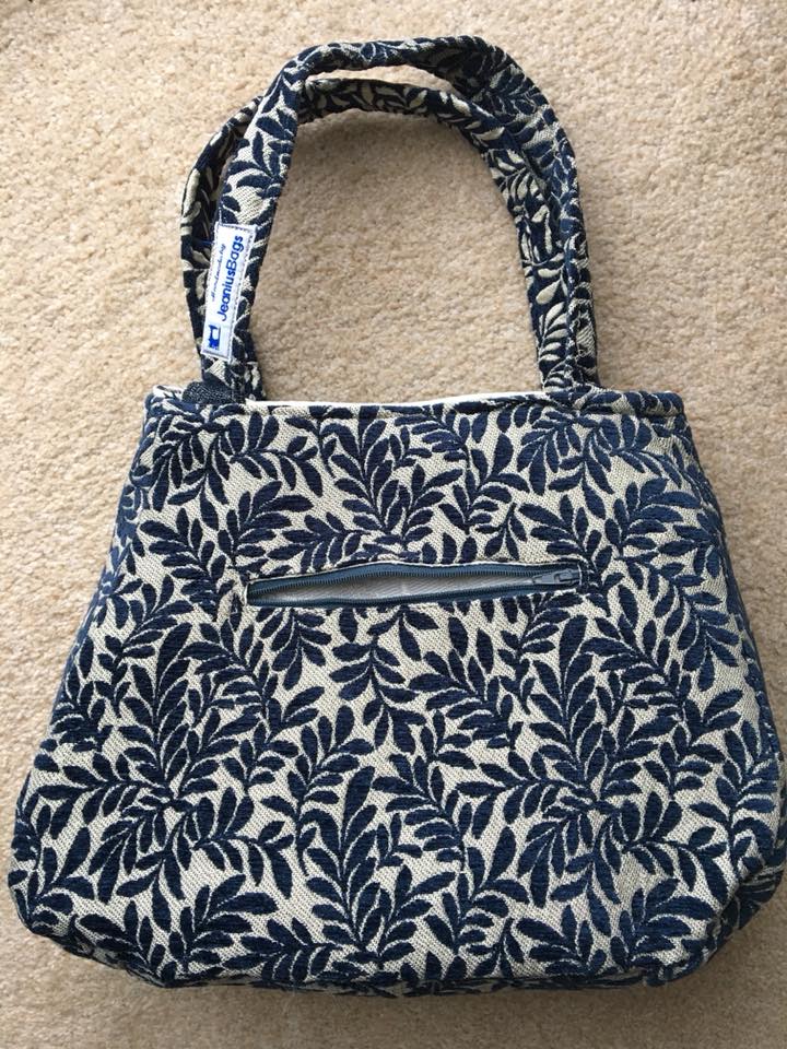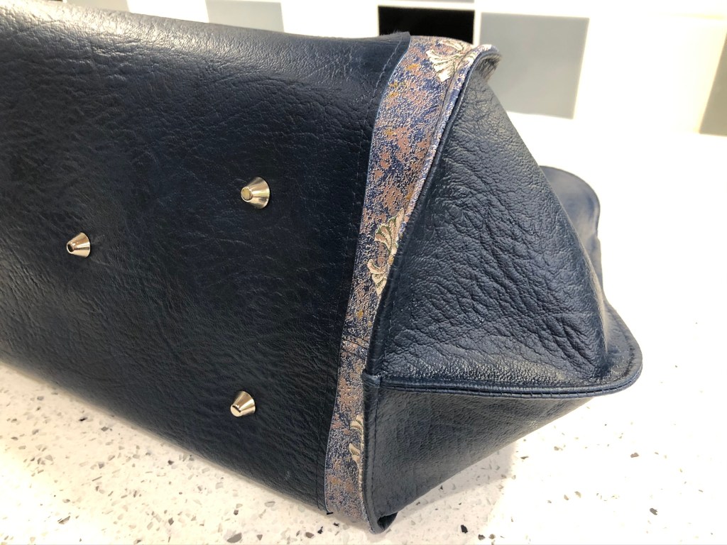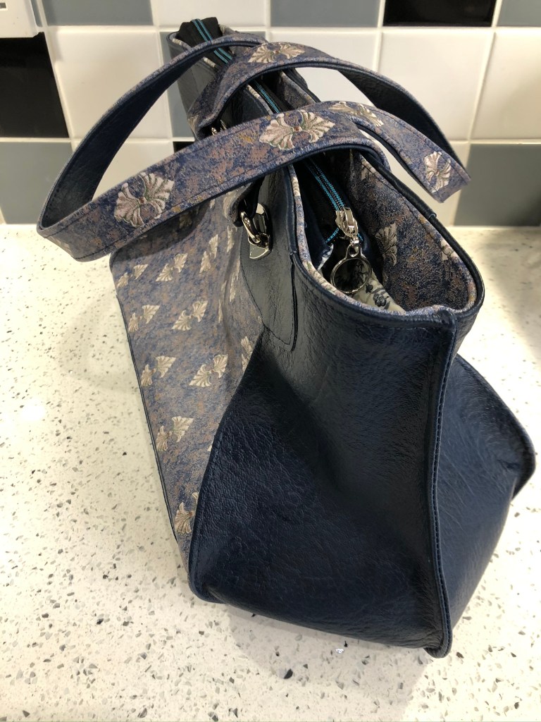 Reversible “Ethel” medium sized tote in navy and cream. Two slip pockets inside and out, also a zippered pockets inside and out. – SOLD