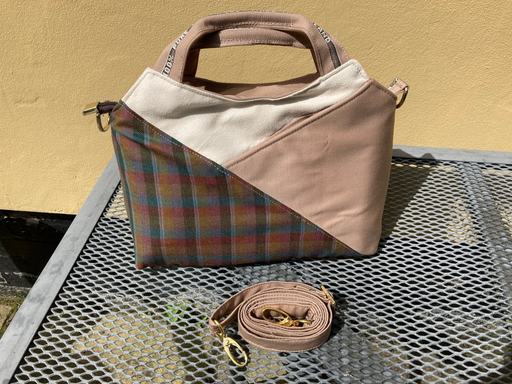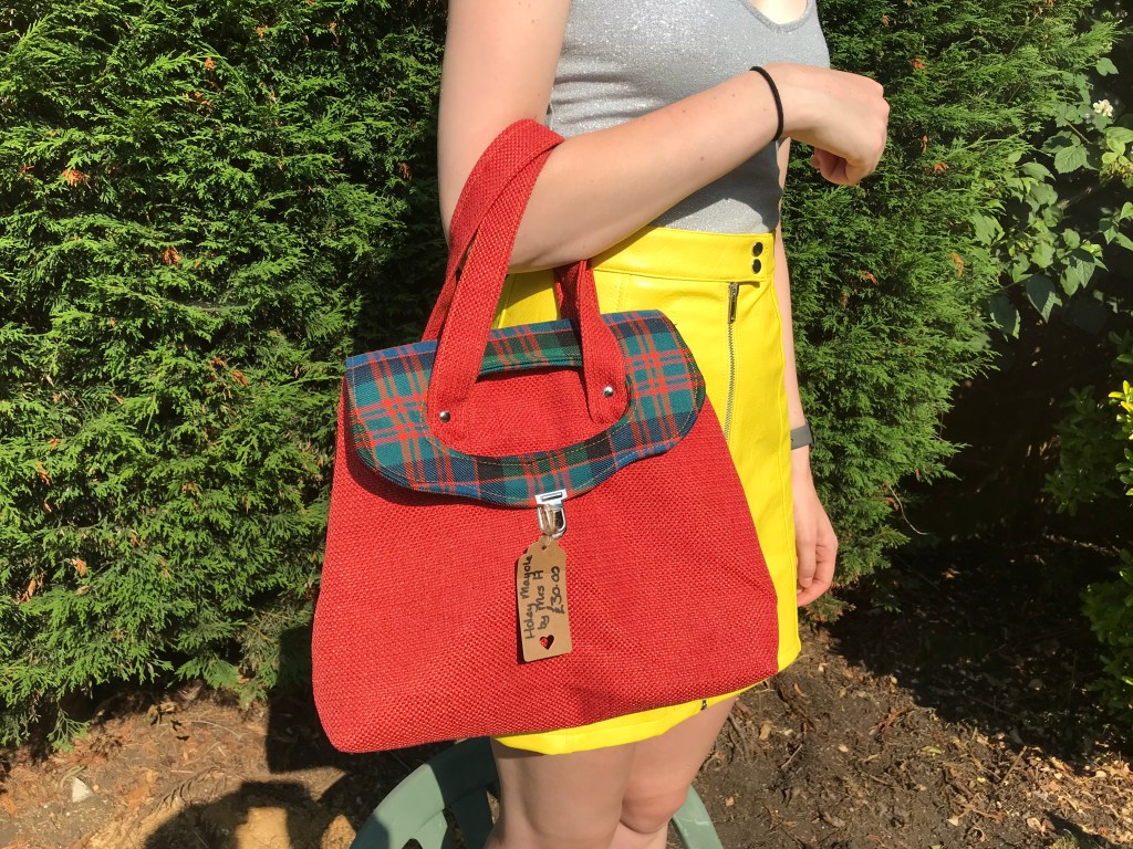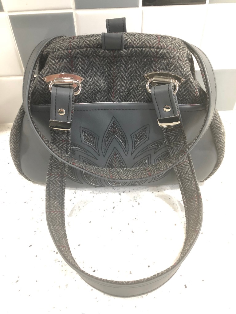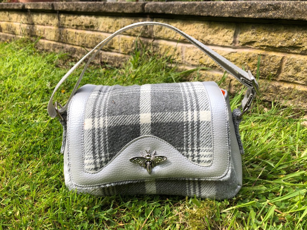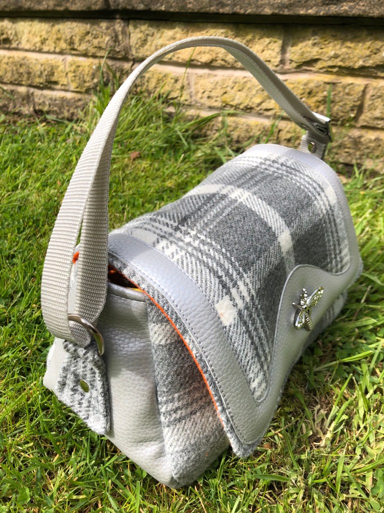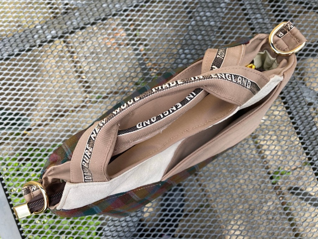 This is the Romulus handbag, a roomy convertible between over the shoulder, cross-body and handbag. The adjustable strap can be removed, and there are zipped and slip pockets inside. The exterior is in lightweight wool tartan and brown faux leather, and the interior is cream coloured satin-feel home décor fabric. £48.00 plus P&P.