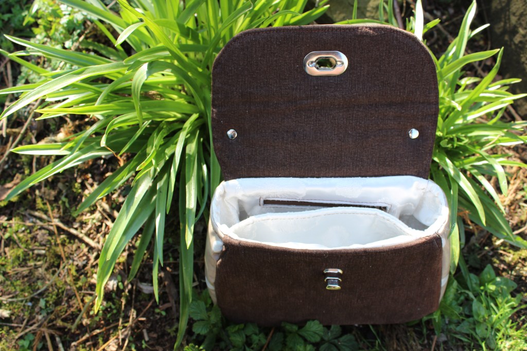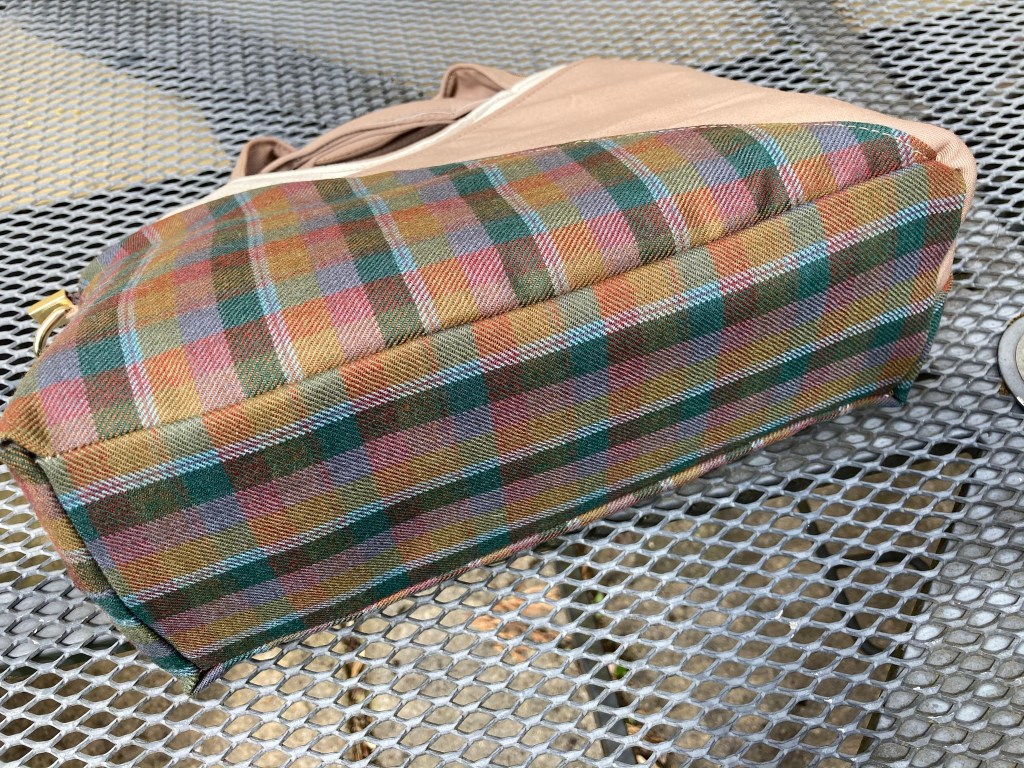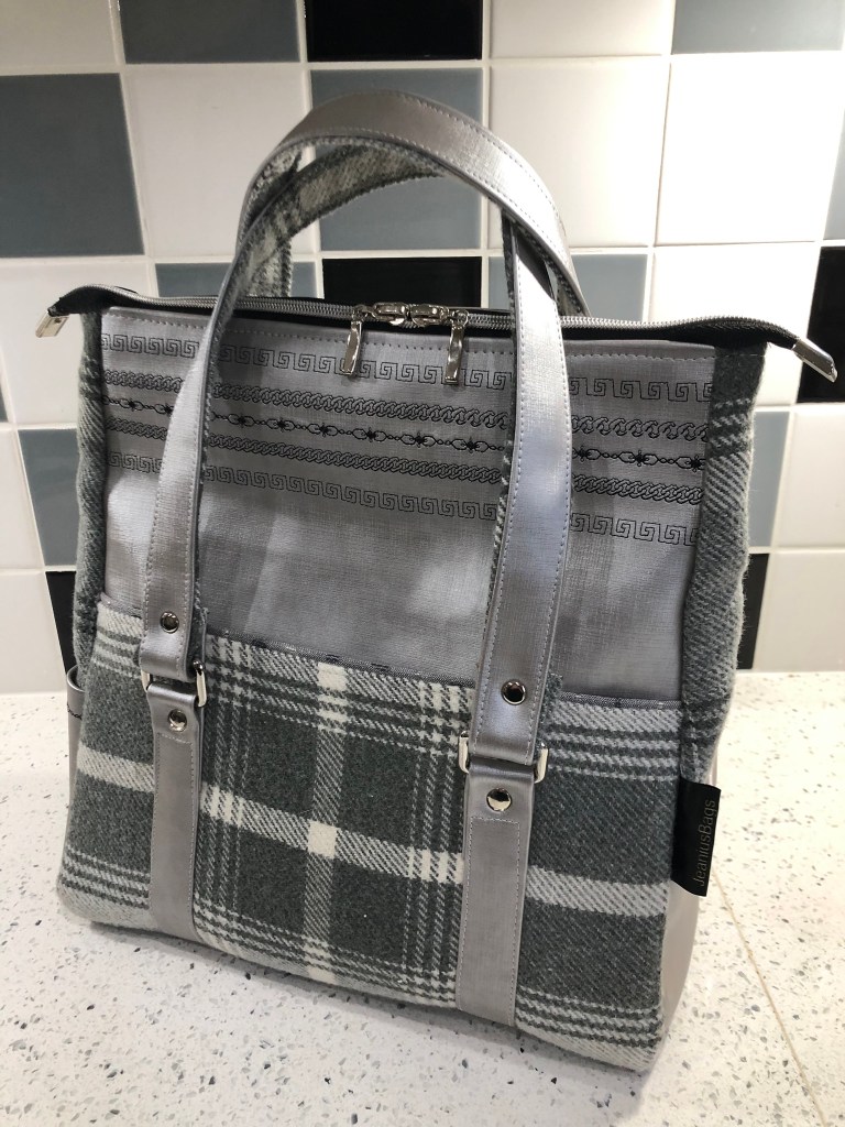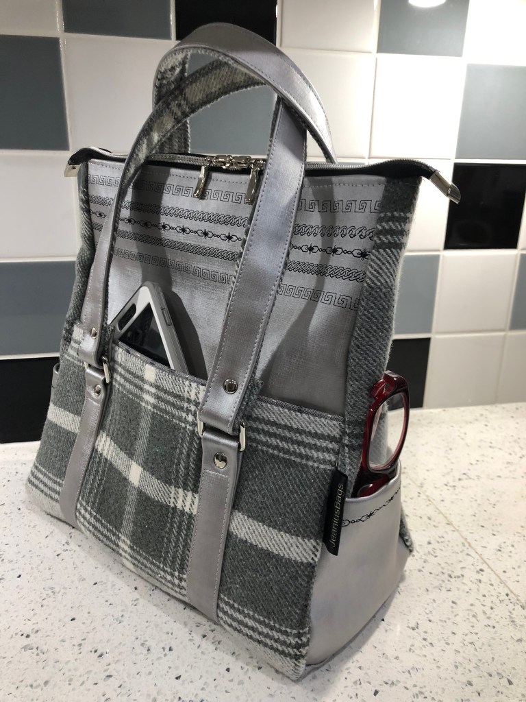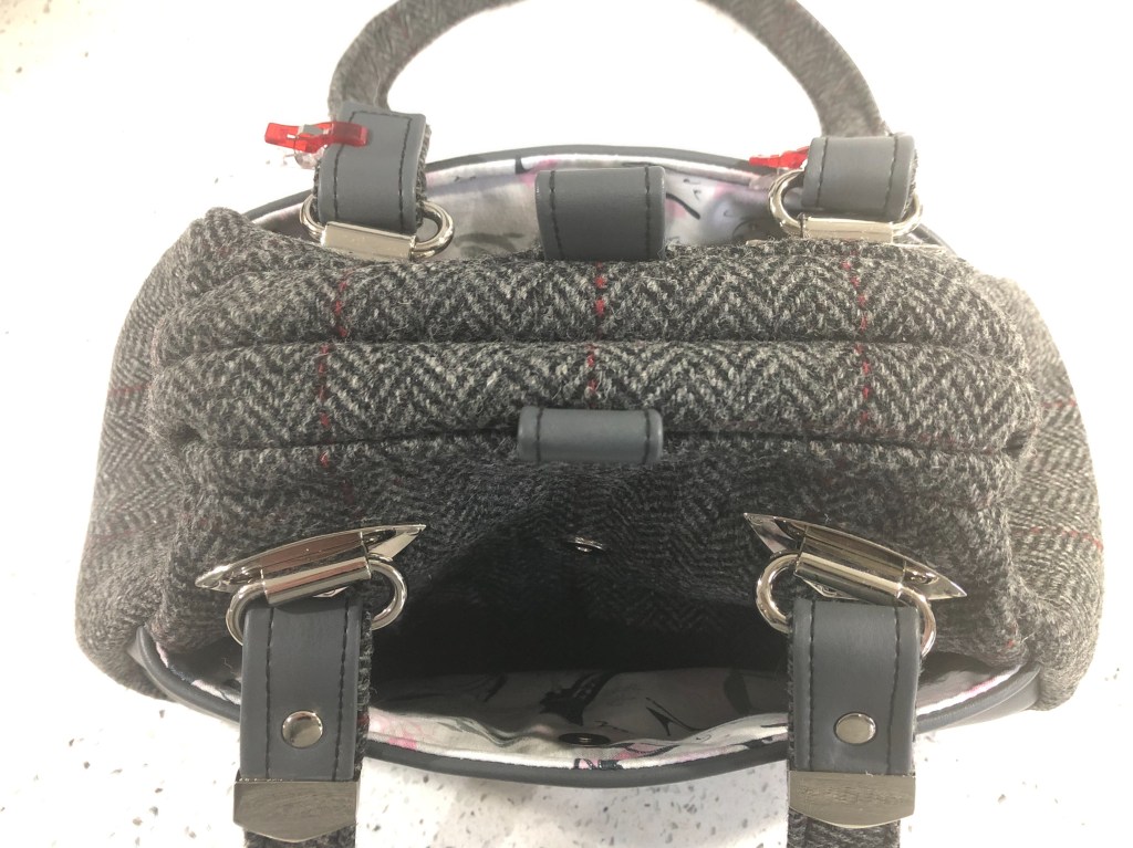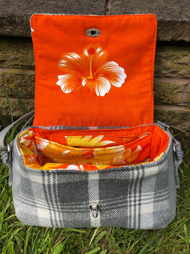 This is the Romulus handbag, a roomy convertible between over the shoulder, cross-body and handbag. The adjustable strap can be removed, and there are zipped and slip pockets inside. The exterior is in lightweight wool tartan and brown faux leather, and the interior is cream coloured satin-feel home décor fabric. £48.00 plus P&P.