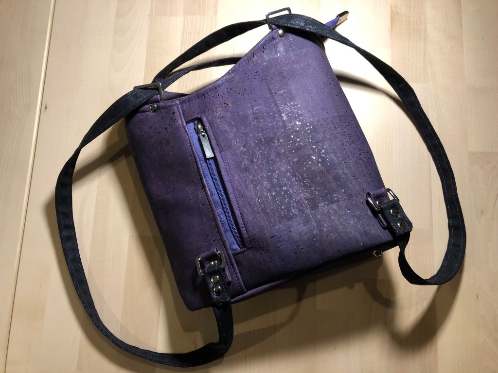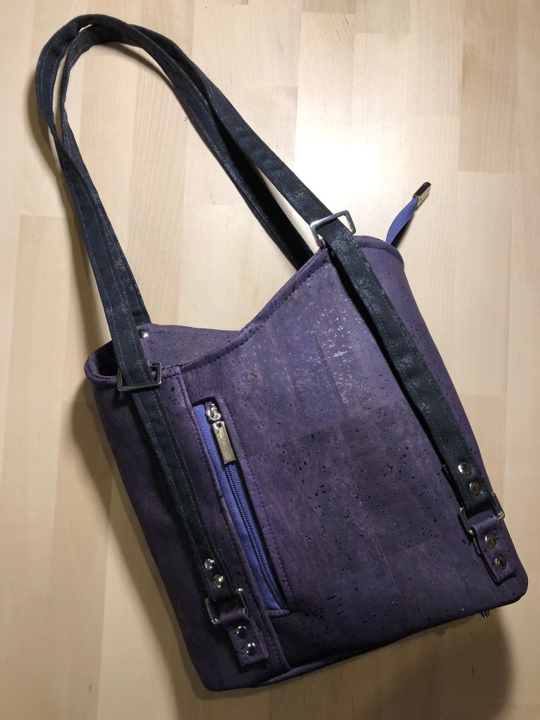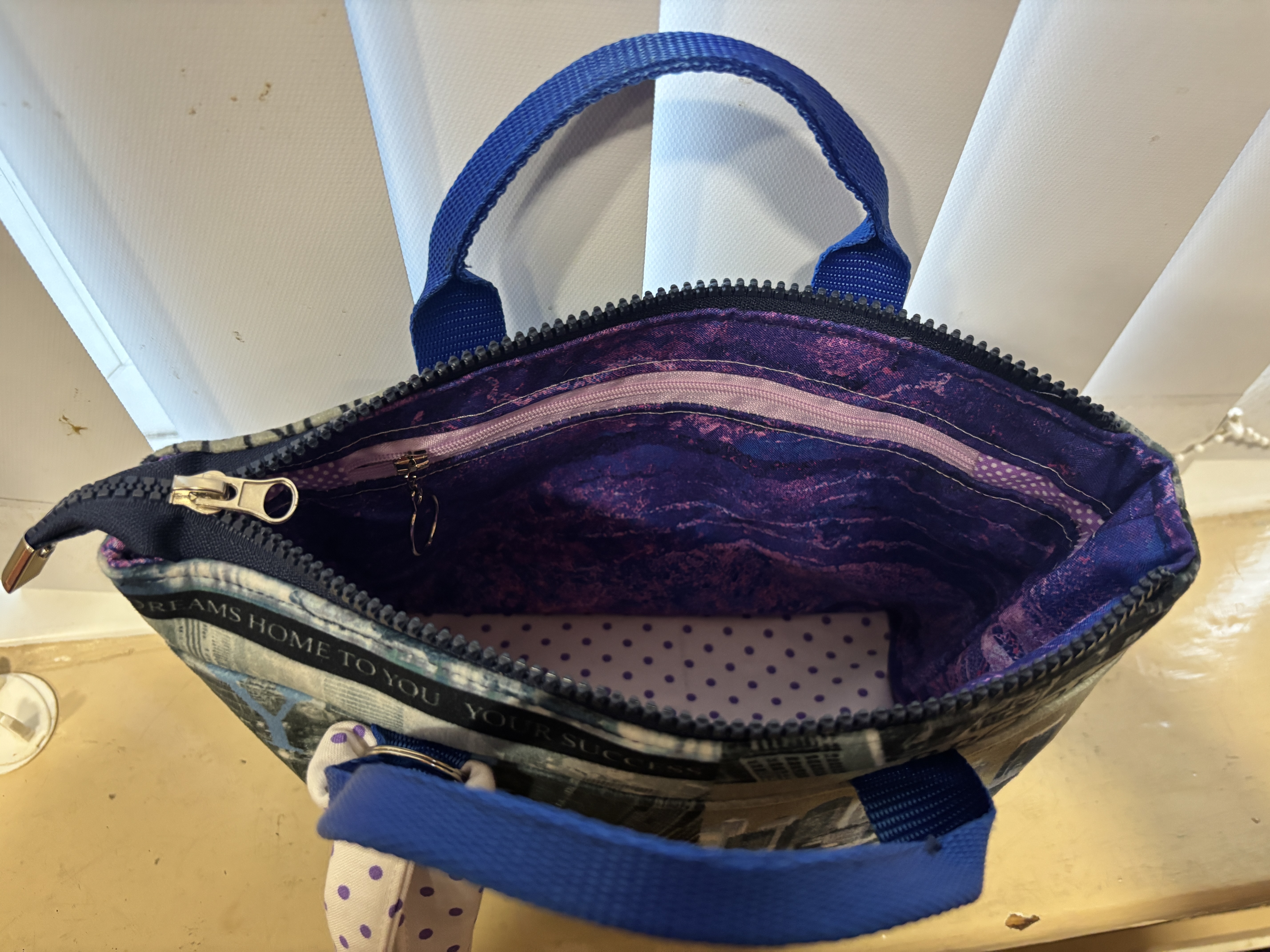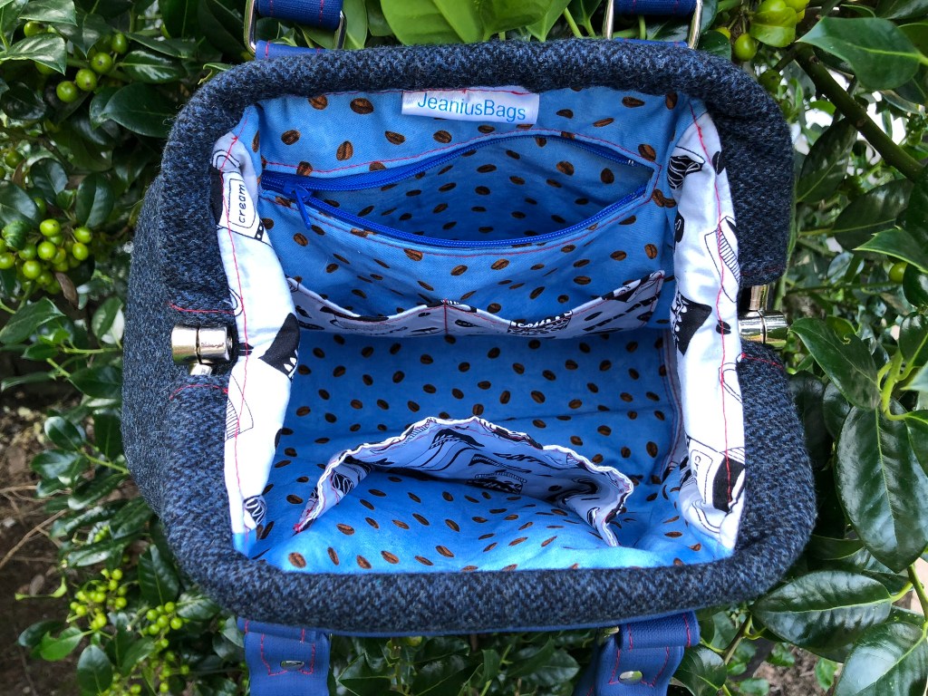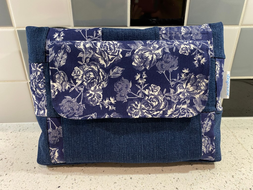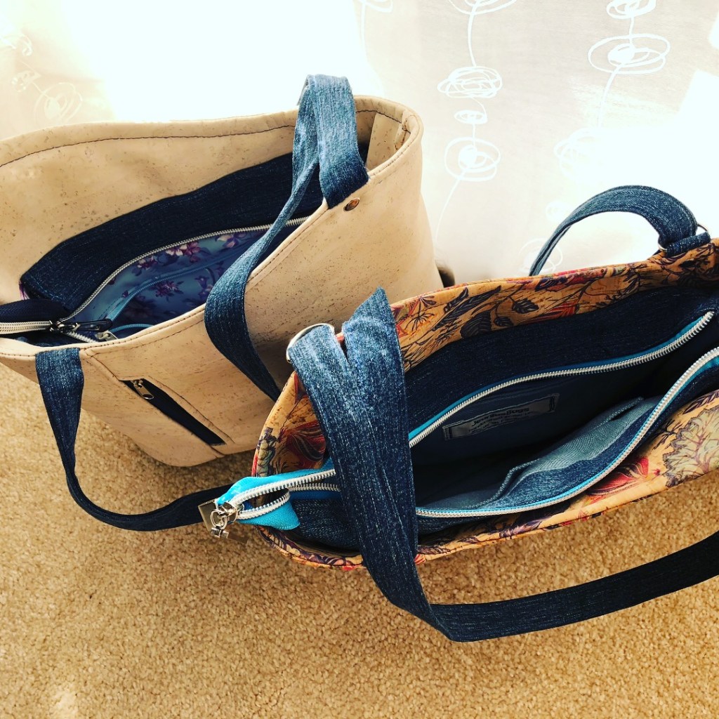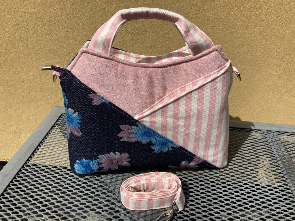 The blue/pink version exterior is in indigo denim with a pink and blue floral print, and pink and white striped cotton canvas. The main lining is purple poly-satin with a contrast floral blue fabric inside the pockets – available.