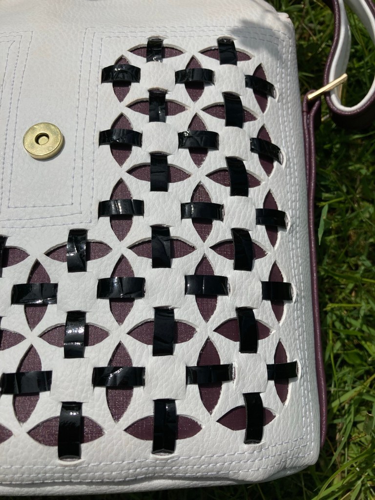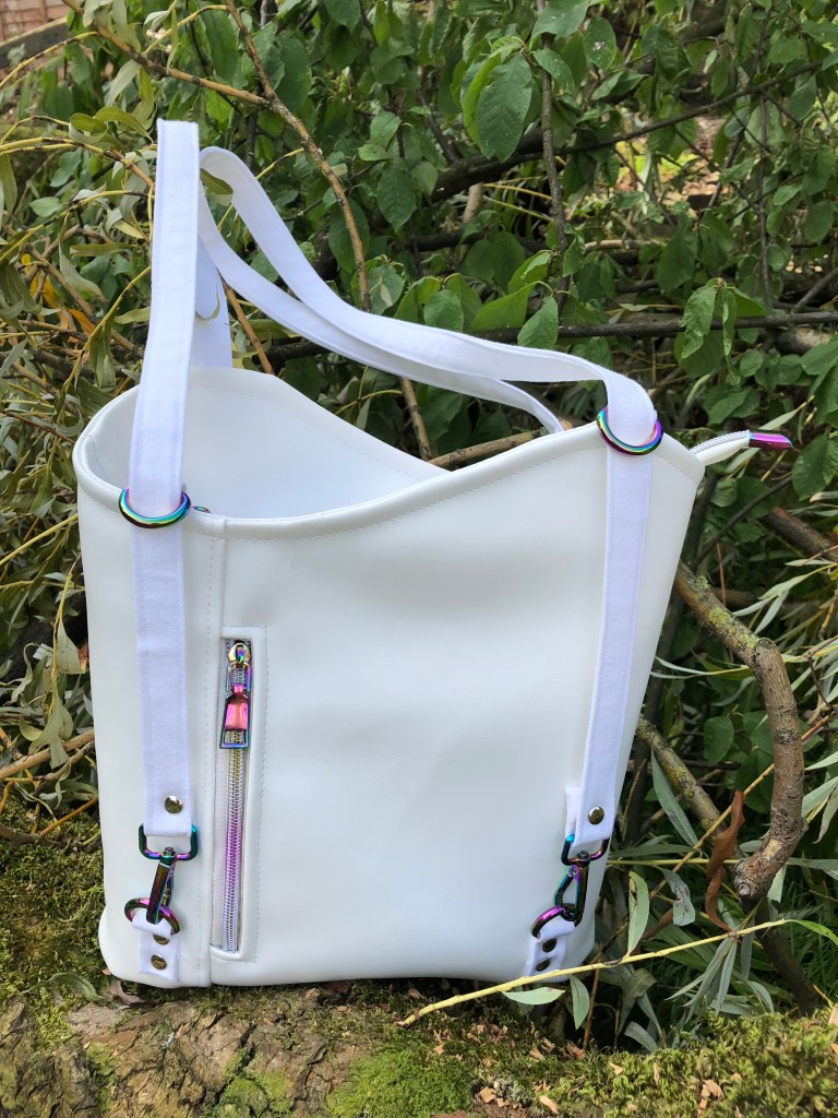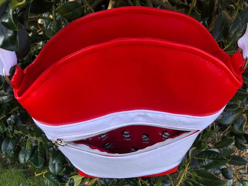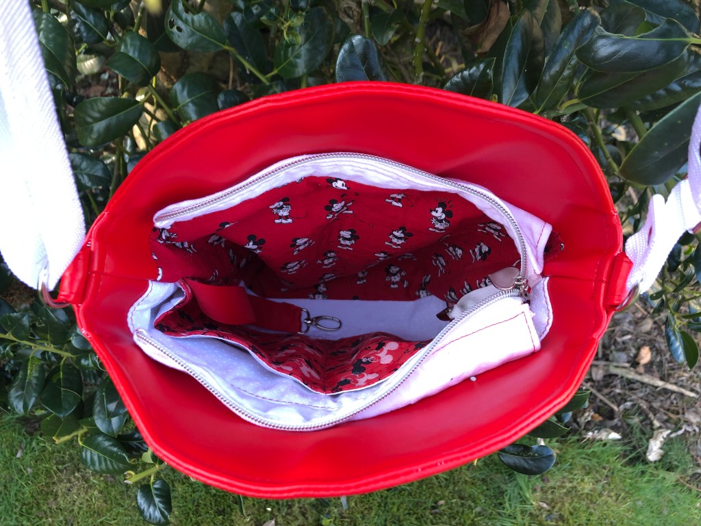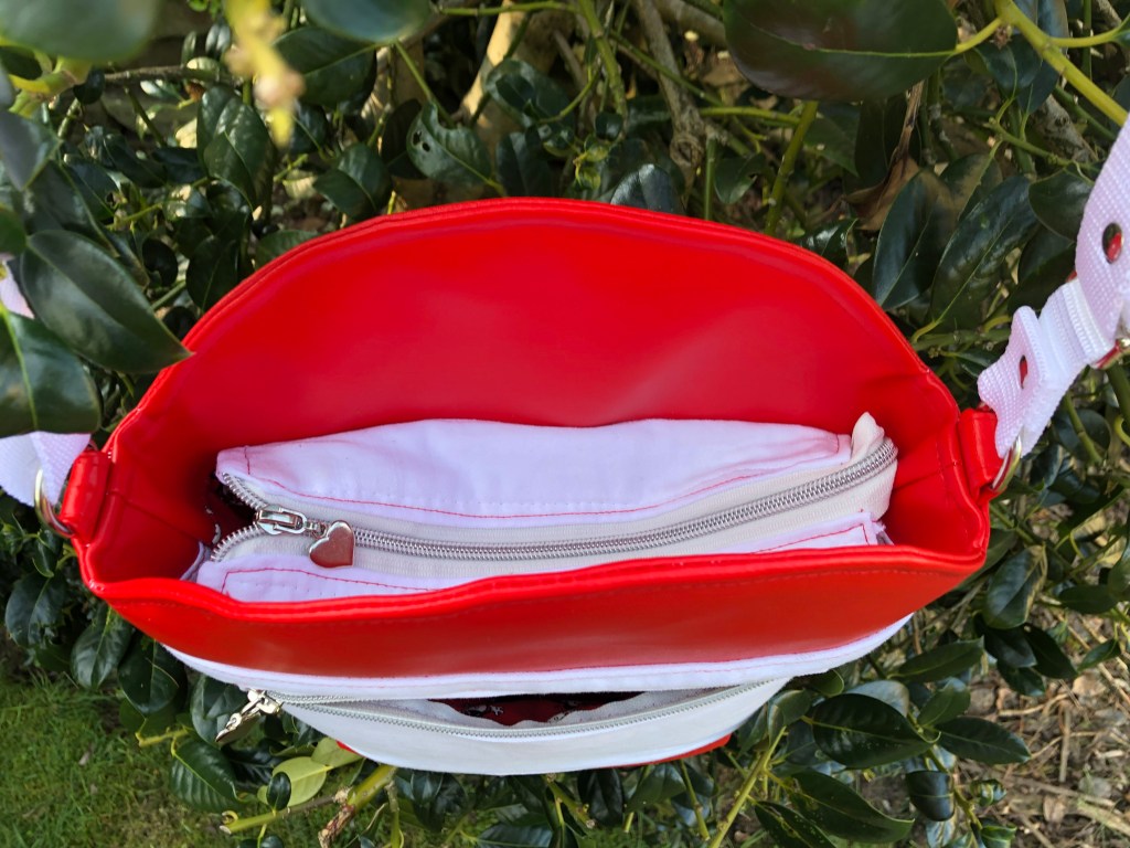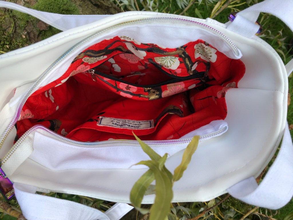 - White faux leather, red Alexander Henry print cotton lining, white straps and iridescent hardware