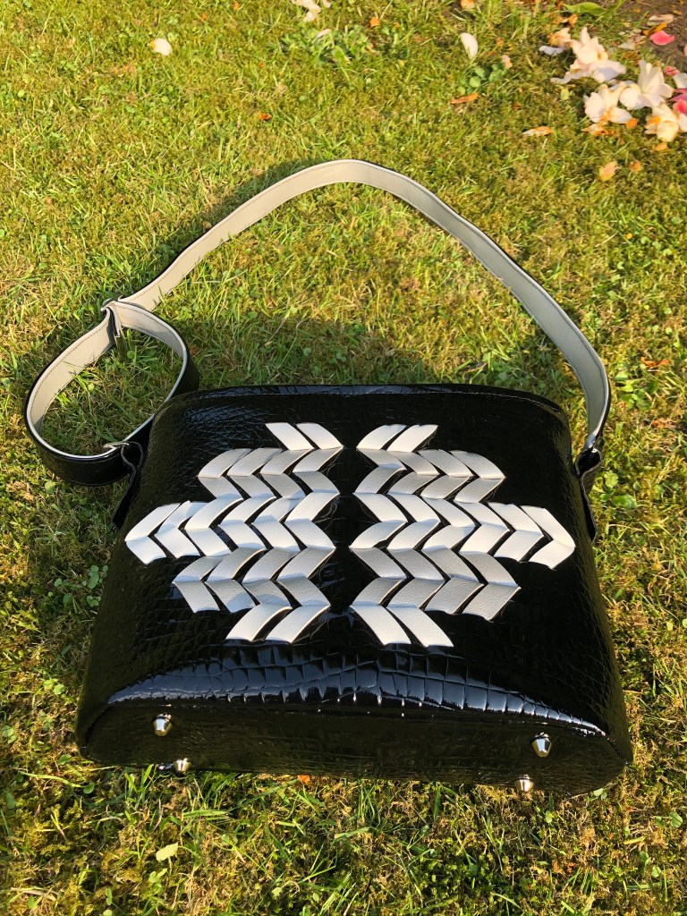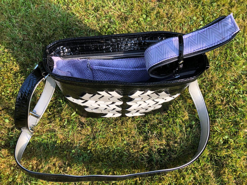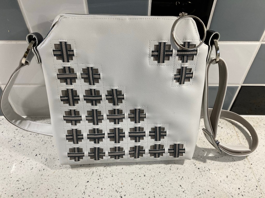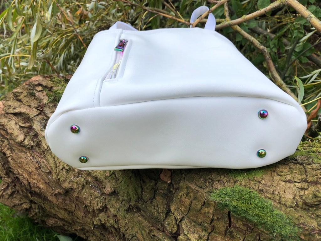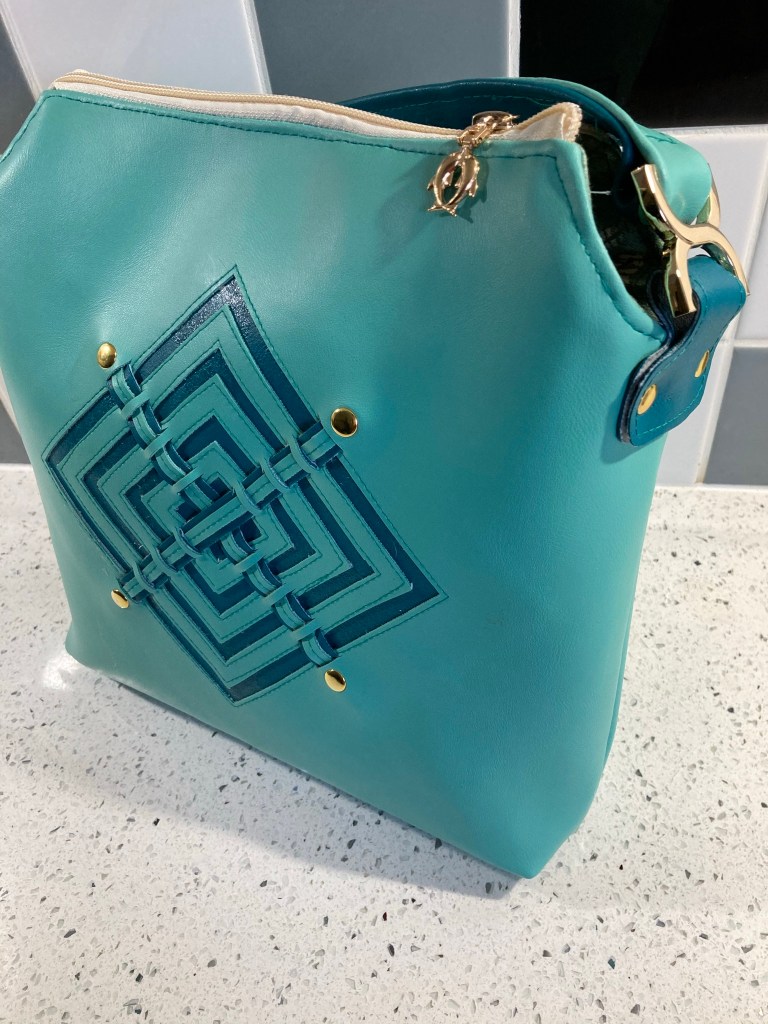 These Halo Handbags are stylish, elegant and practical. Why “Halo”? Because of the circular shape around the strap anchors. For the white bag, this is echoed in the large round strap connectors and zipper pulls. The aqua bag echoes the haloes with semi-circular strap anchors and oval zipper pulls.