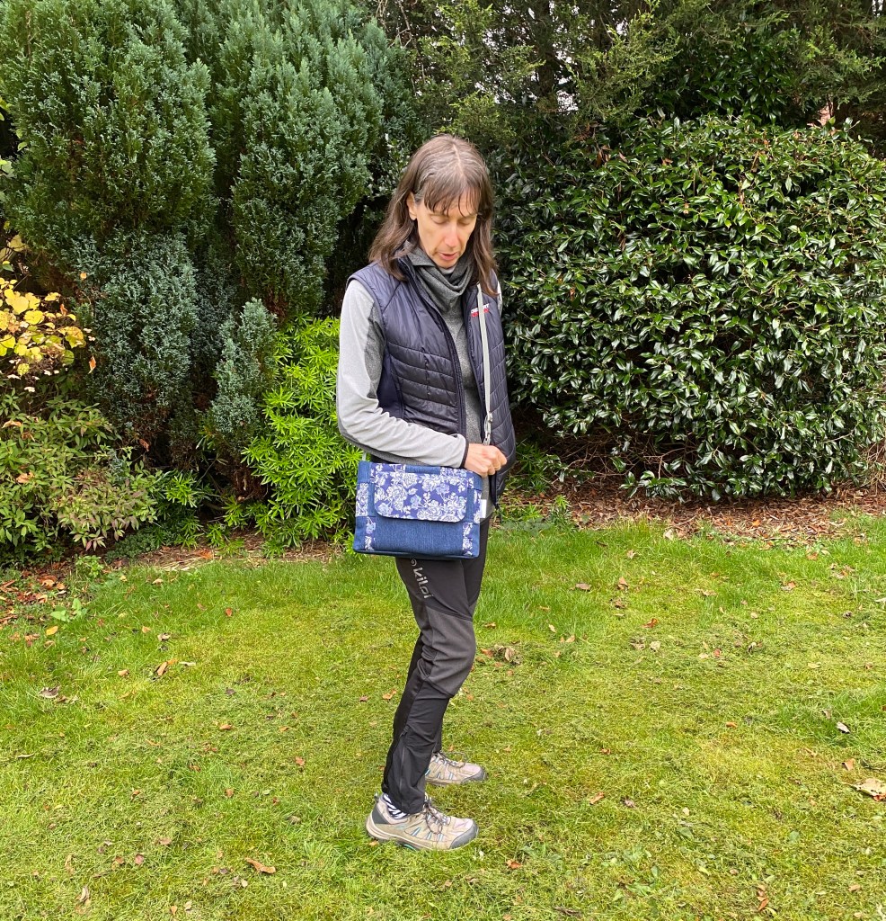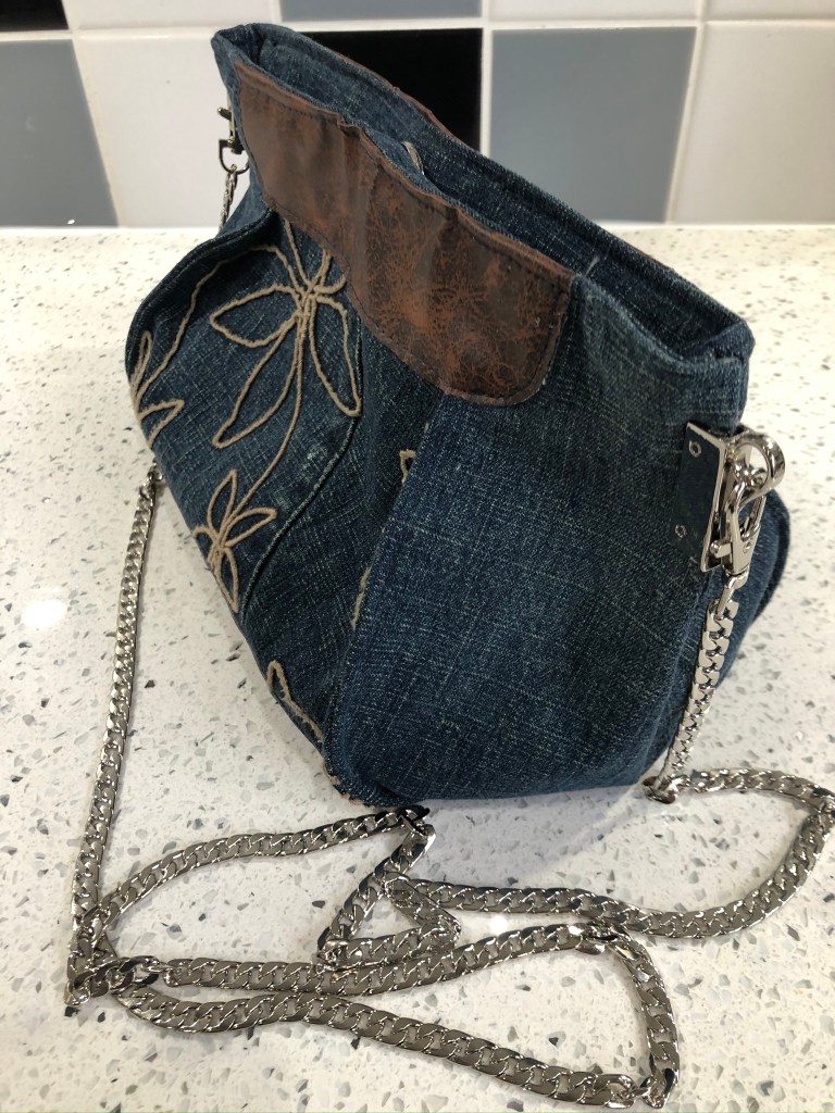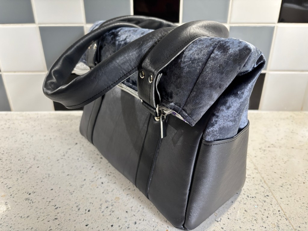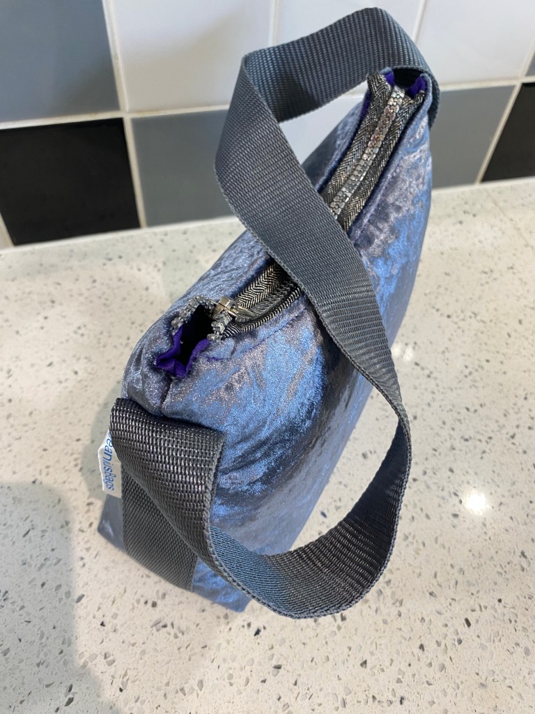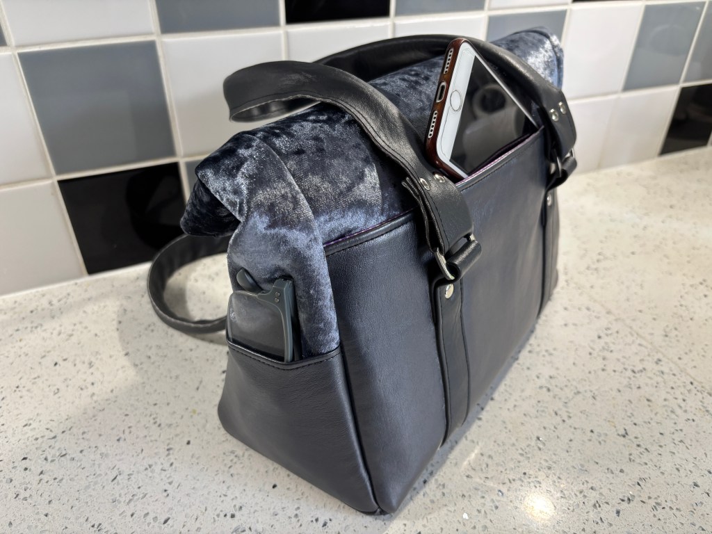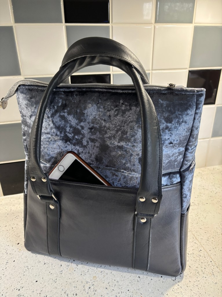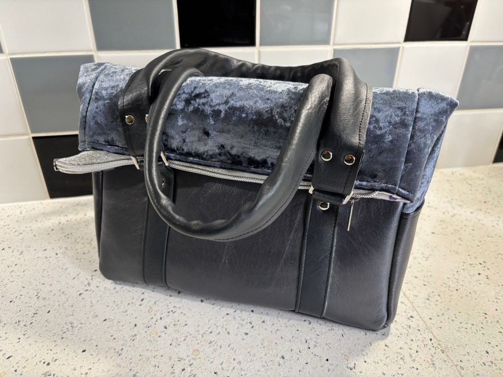 Atelier bags are perfect when you have lots to carry, but still want to look stylish. The blue one (sold) is in recovered denim, with blue faux leather accents, and the silver-grey is in padded crushed velvet with grey faux leather accents. There are 8 exterior slip pockets, 3 interior slip pockets, a large interior zipped pocket, and an integral specs case. With the top folded over it sits nicely under your shoulder, and fully extended it’s large enough for A4 items. £65 plus P&P.