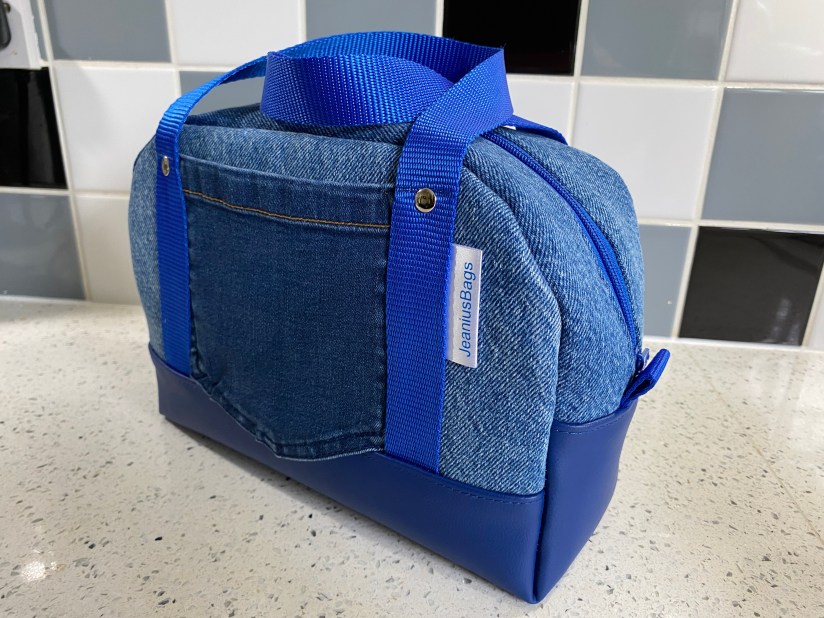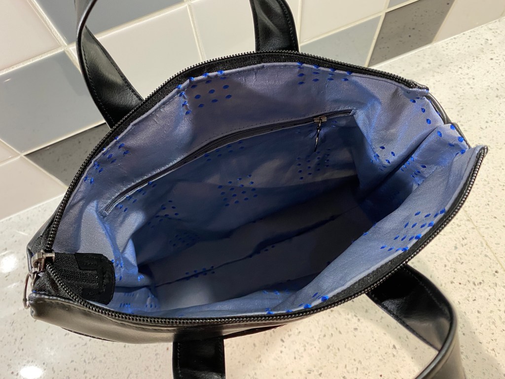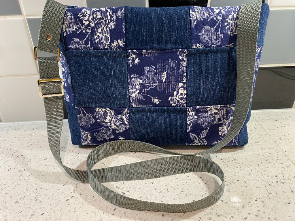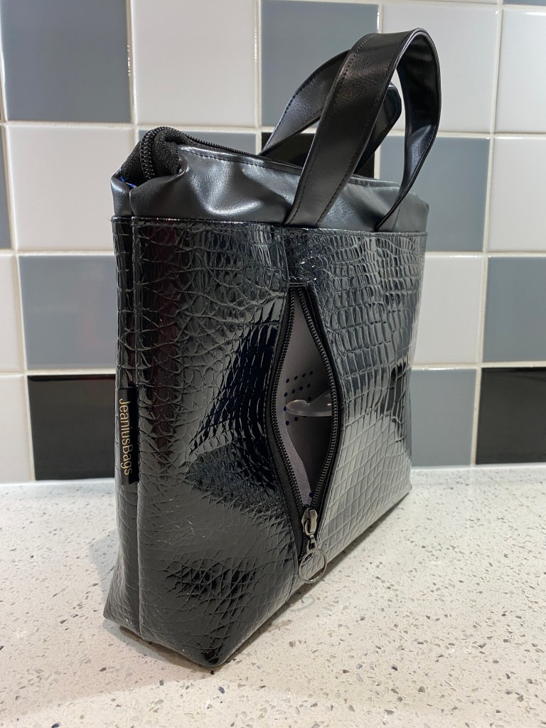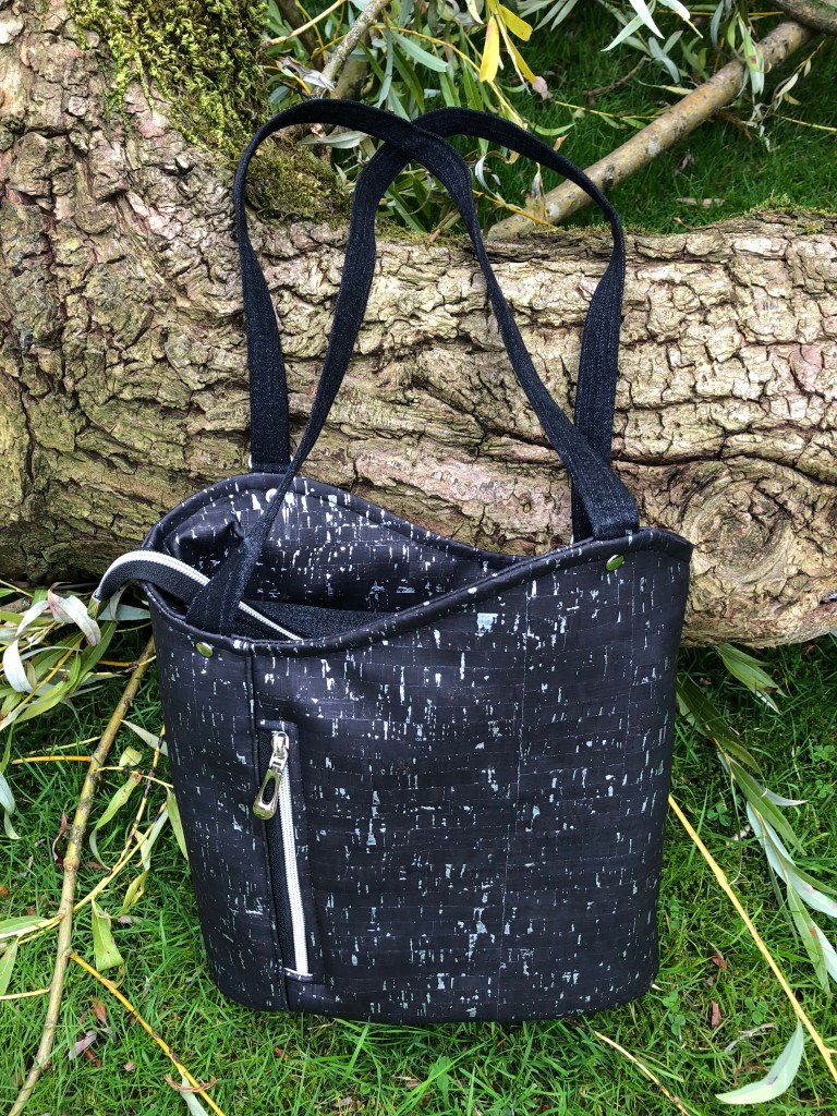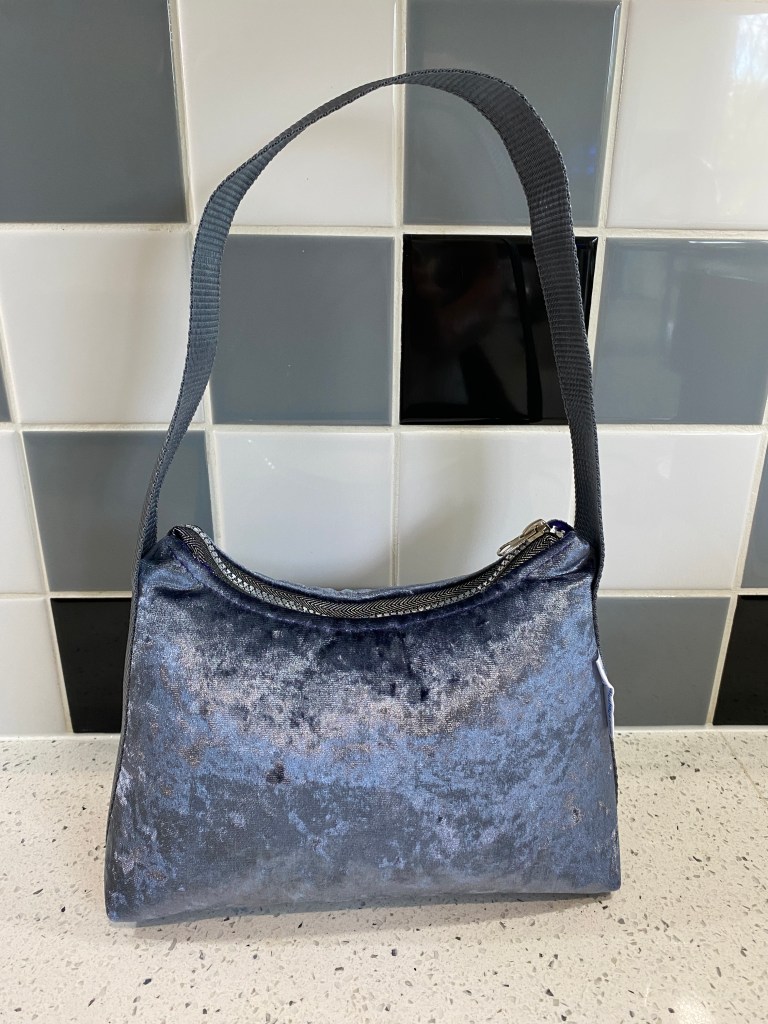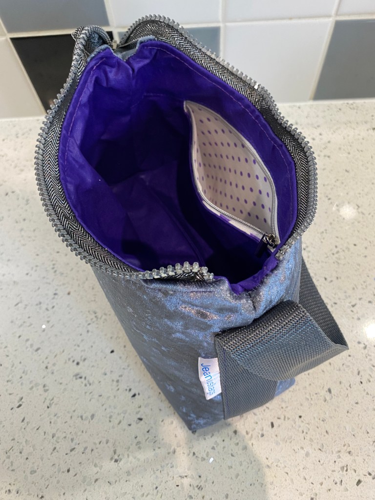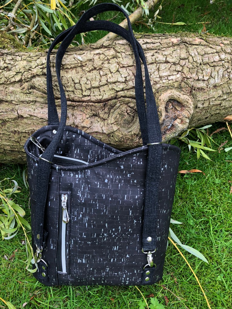 Atelier bags are perfect when you have lots to carry, but still want to look stylish. The blue one (sold) is in recovered denim, with blue faux leather accents, and the silver-grey is in padded crushed velvet with grey faux leather accents. There are 8 exterior slip pockets, 3 interior slip pockets, a large interior zipped pocket, and an integral specs case. With the top folded over it sits nicely under your shoulder, and fully extended it’s large enough for A4 items. £65 plus P&P.