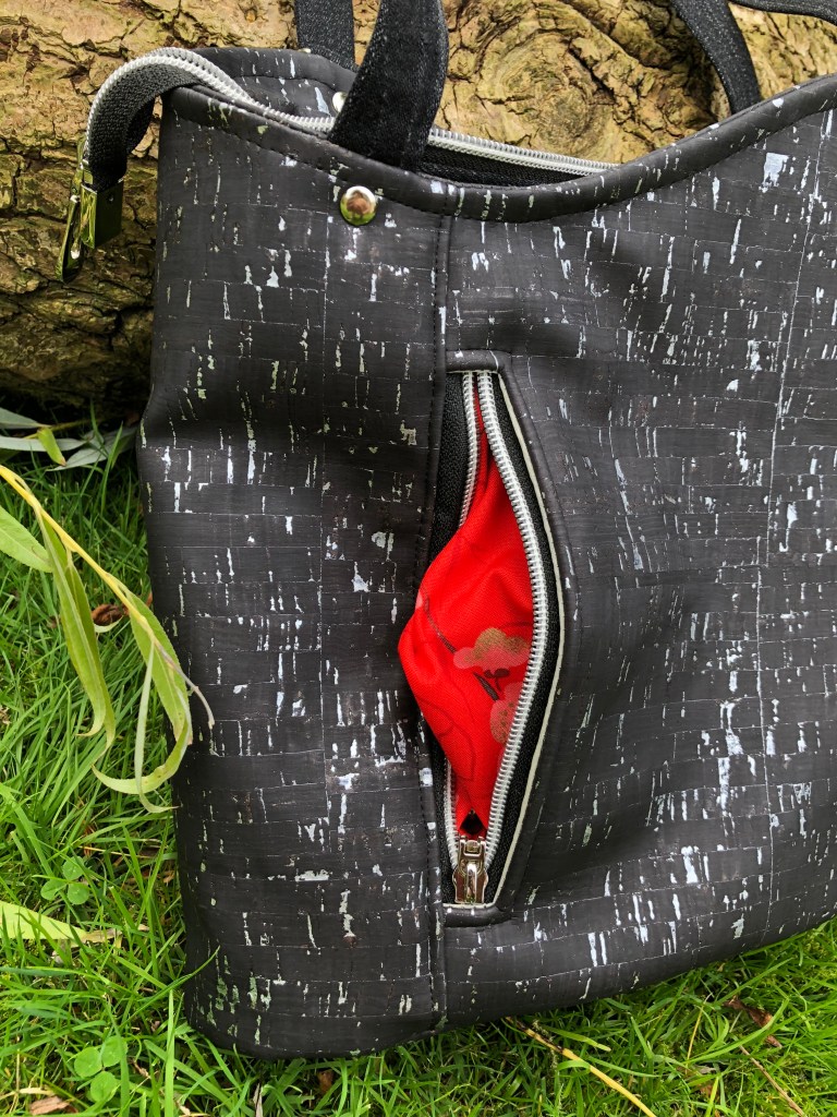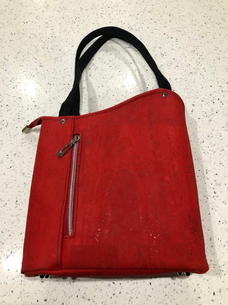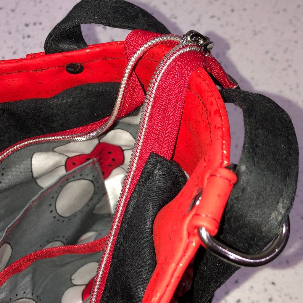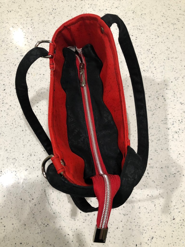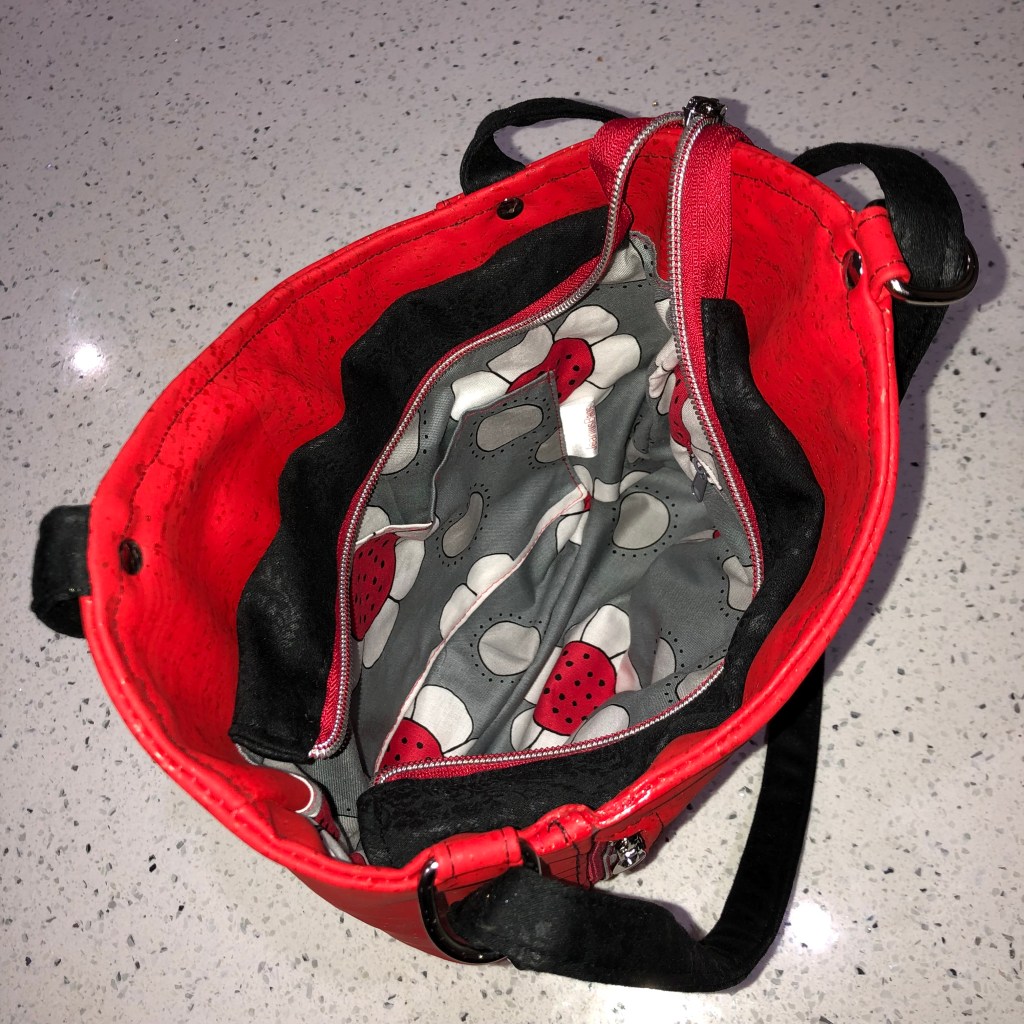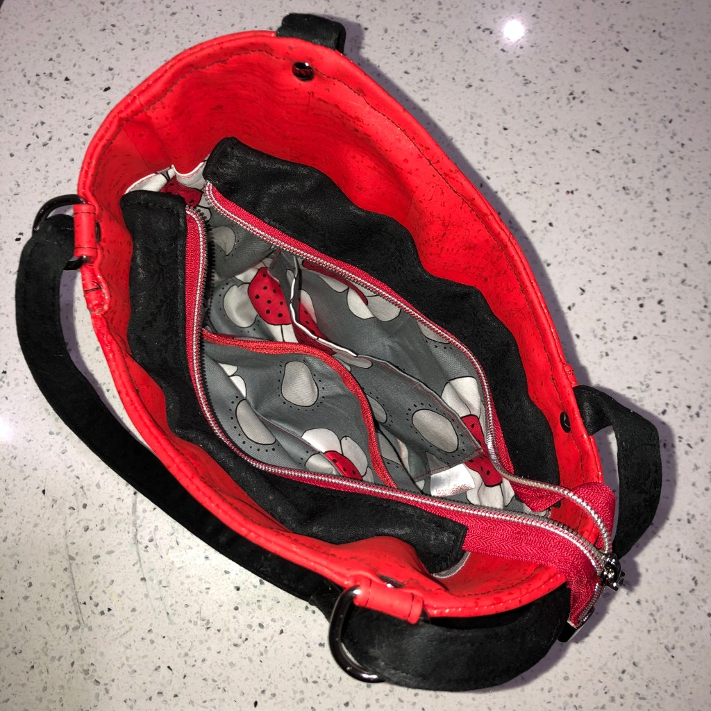 - Black cork with silver accents, a red Alexander Henry print cotton for the lining, black straps and silver hardware
