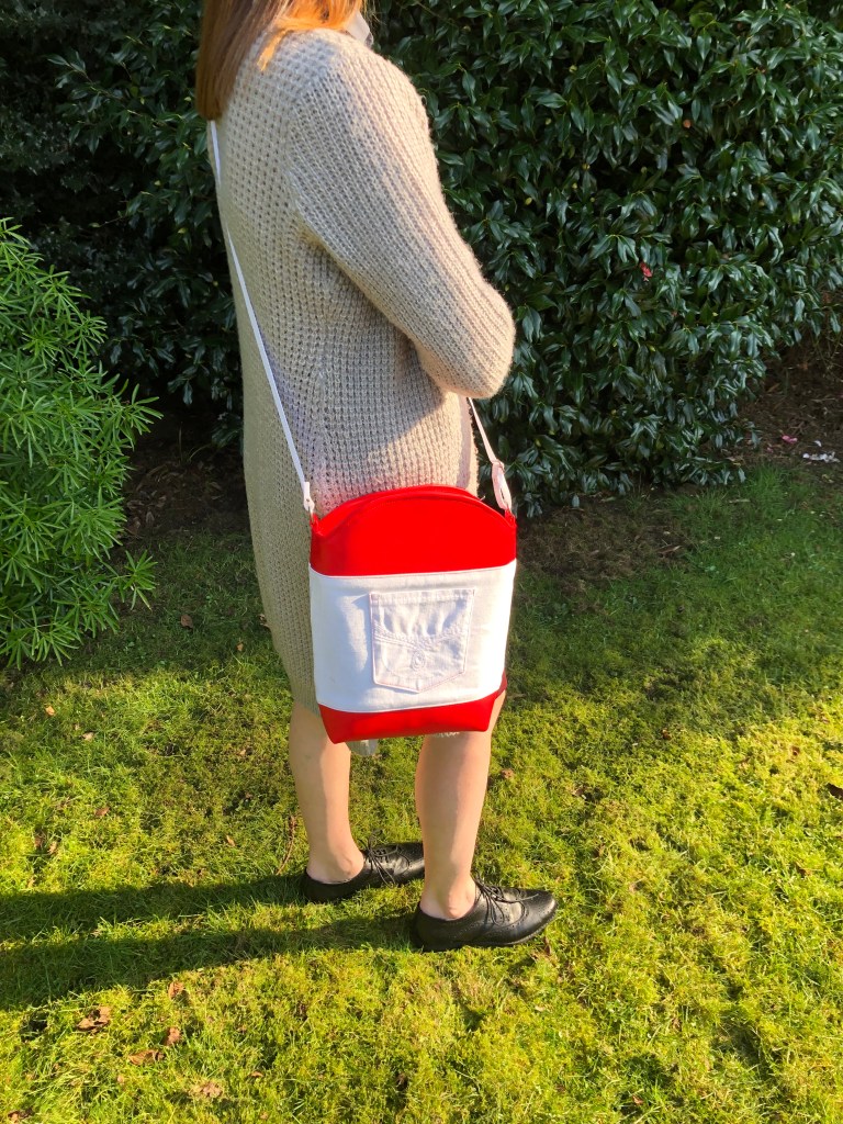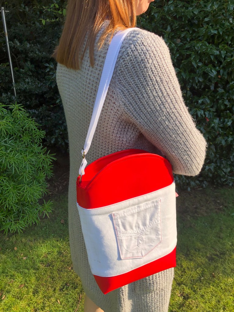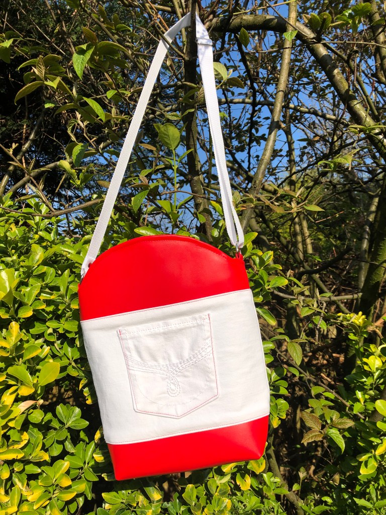 Here is a Mayla Bucket Bag in white denim with red faux leather top and base. There are plenty of zipped and slip pockets inside and out, and there is a magnetic snap fastening at the top. With a fully adjustable strap you can wear it over the shoulder or cross-body.