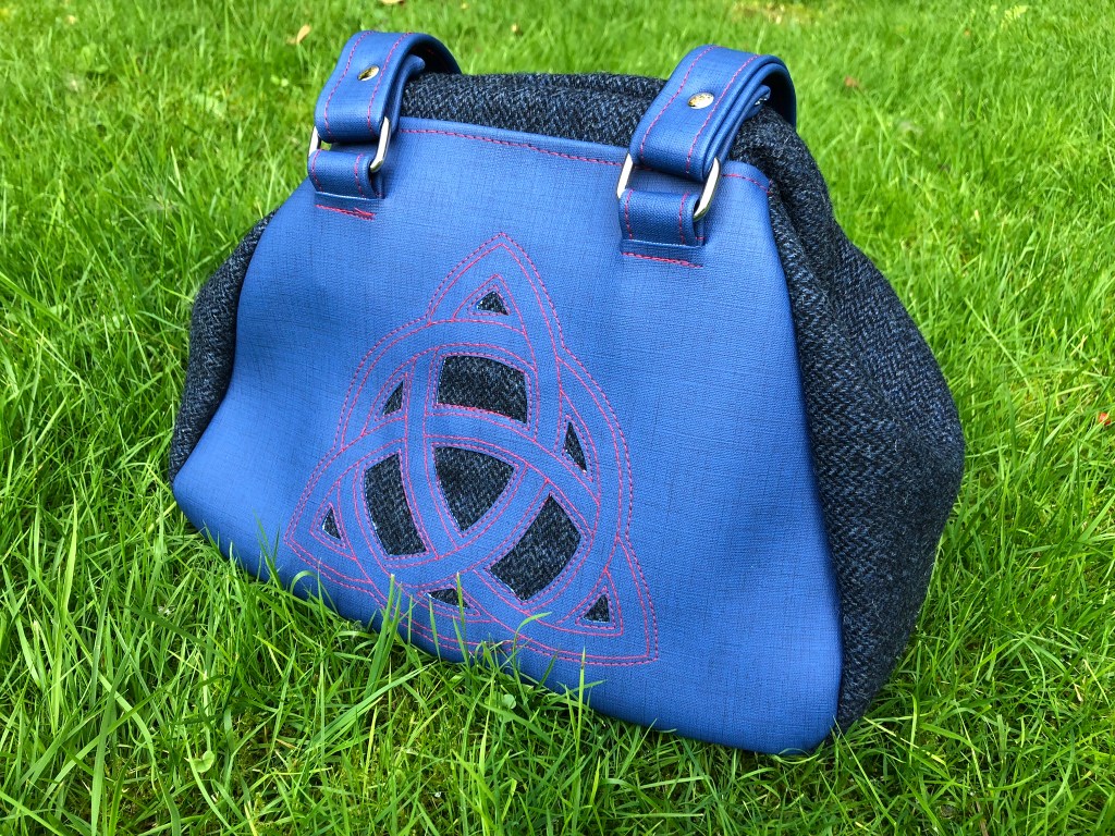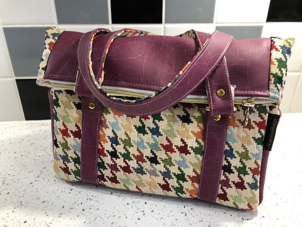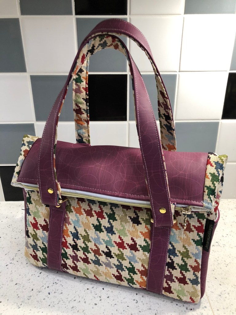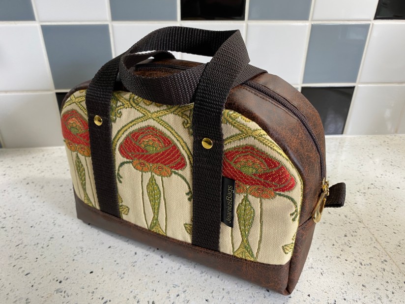 The Companion Carpet Bag holds a surprising amount of stuff! there are exterior slip pockets front and back, as well as interior slip and zipped pockets. The top fastens with a neat sprung frame. £85.00 each plus P&P. These examples are in handwoven tweed from Mucros (near Killarney) and faux leather decorated with reverse applique. The linings are 100% cotton. – SOLD