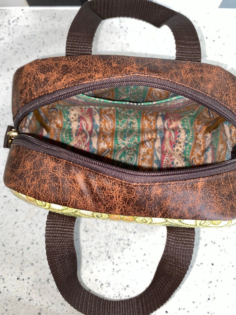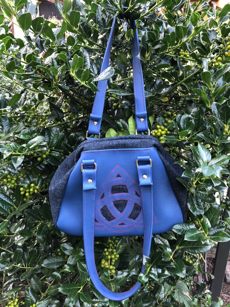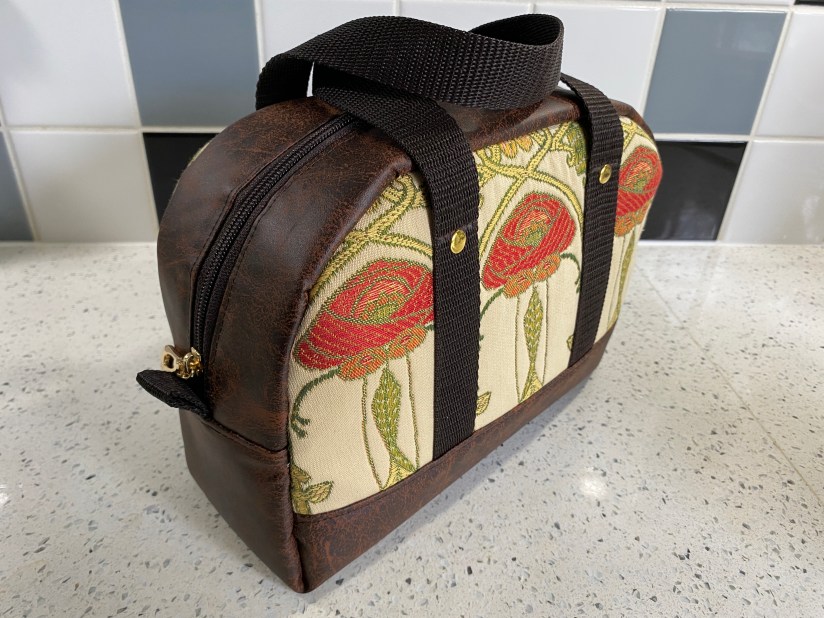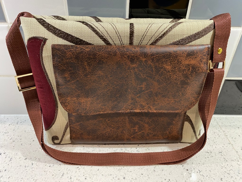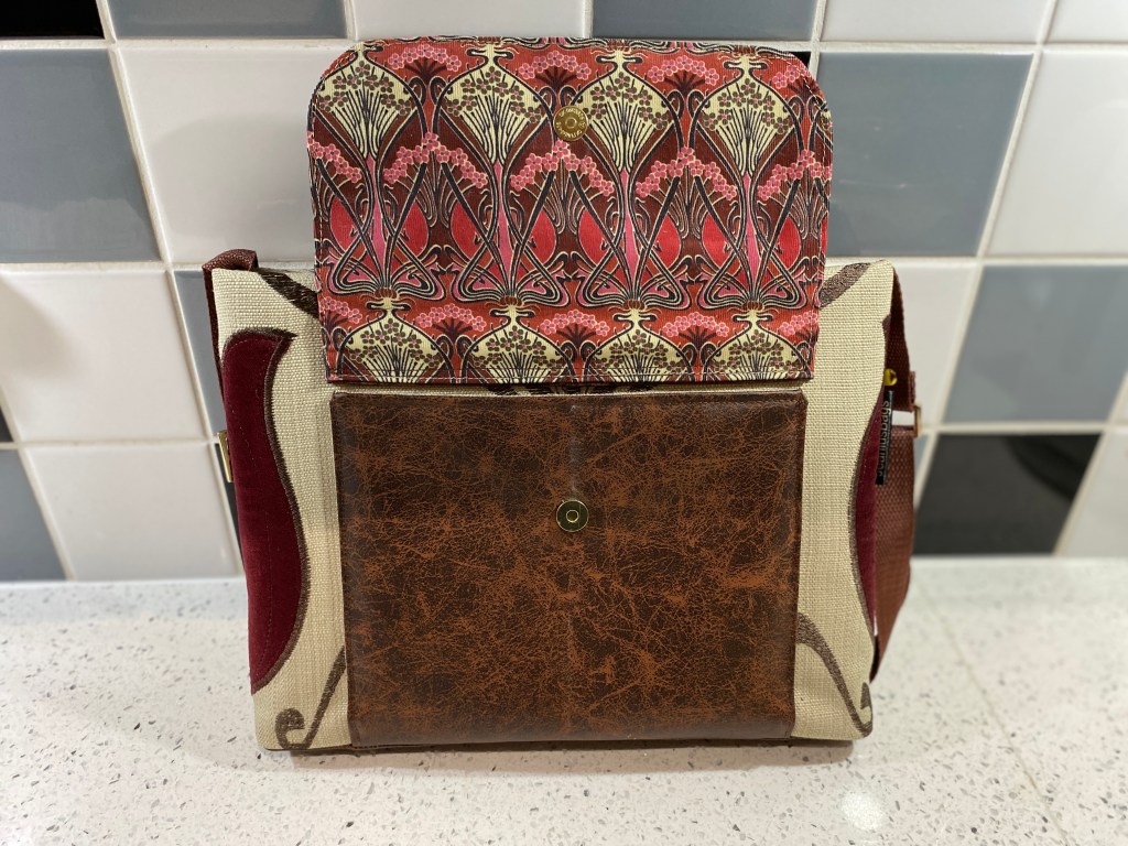 The Companion Carpet Bag holds a surprising amount of stuff! there are exterior slip pockets front and back, as well as interior slip and zipped pockets. The top fastens with a neat sprung frame. £85.00 each plus P&P. These examples are in handwoven tweed from Mucros (near Killarney) and faux leather decorated with reverse applique. The linings are 100% cotton. – SOLD