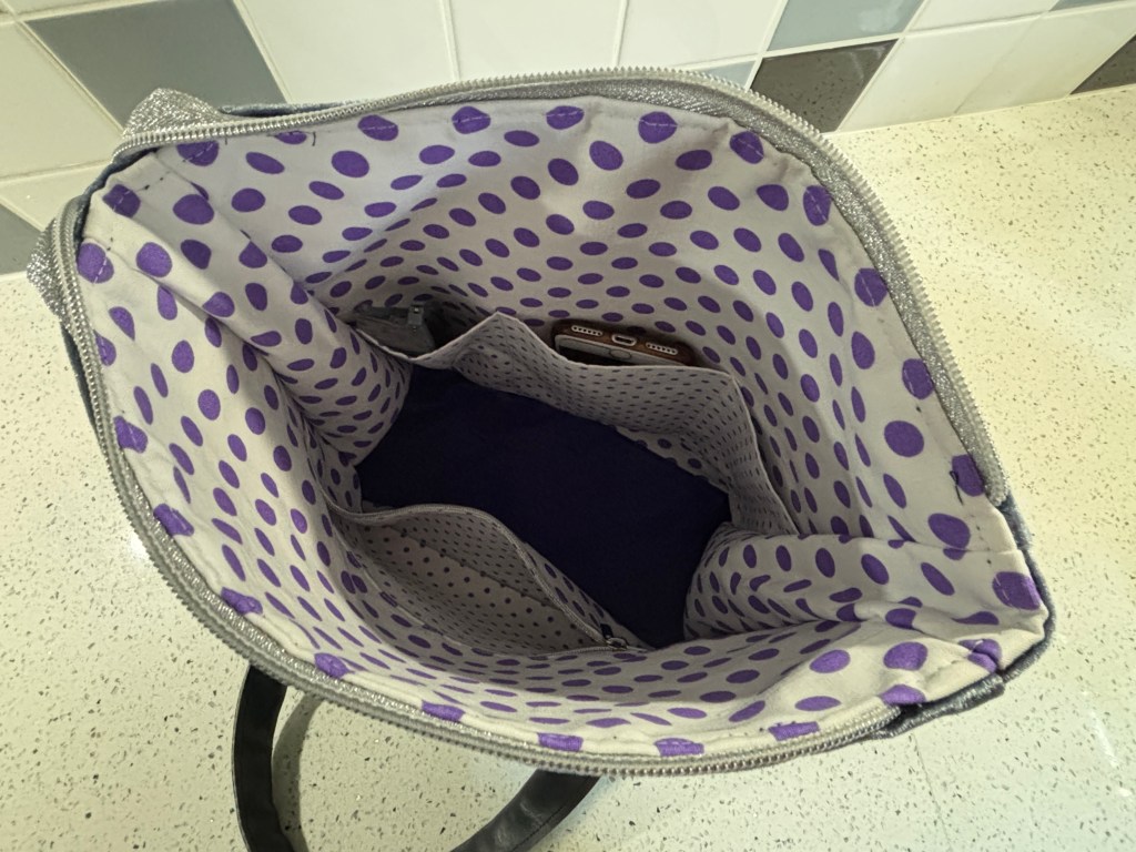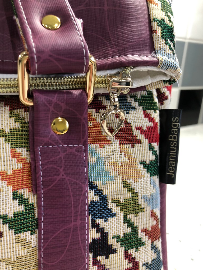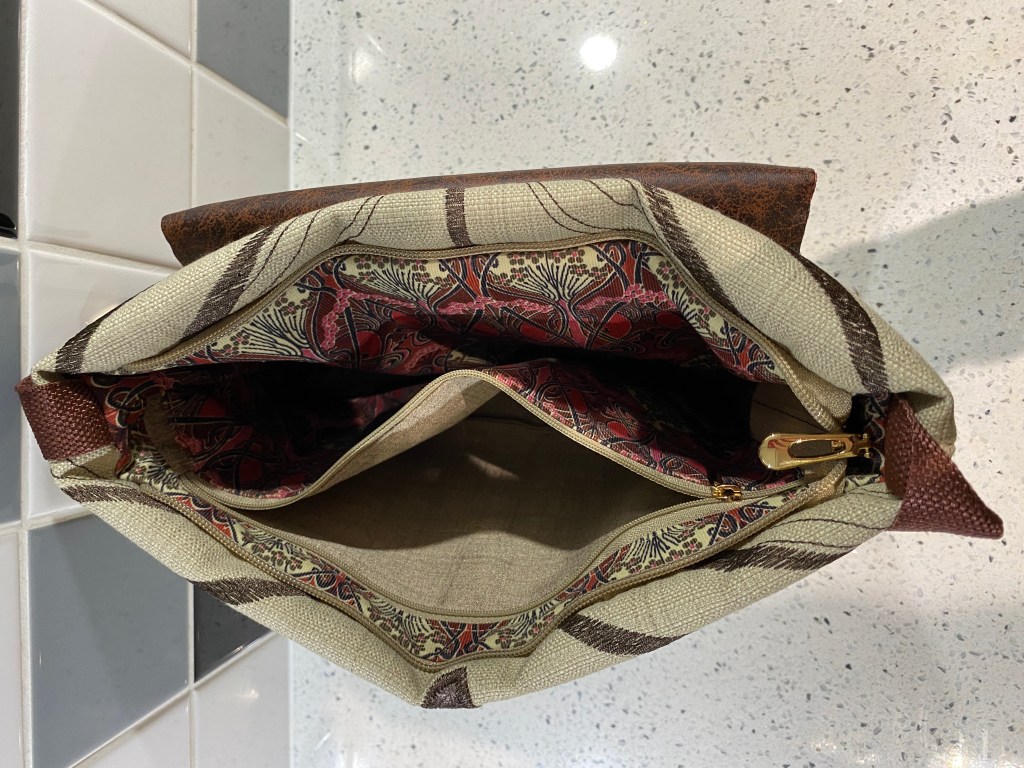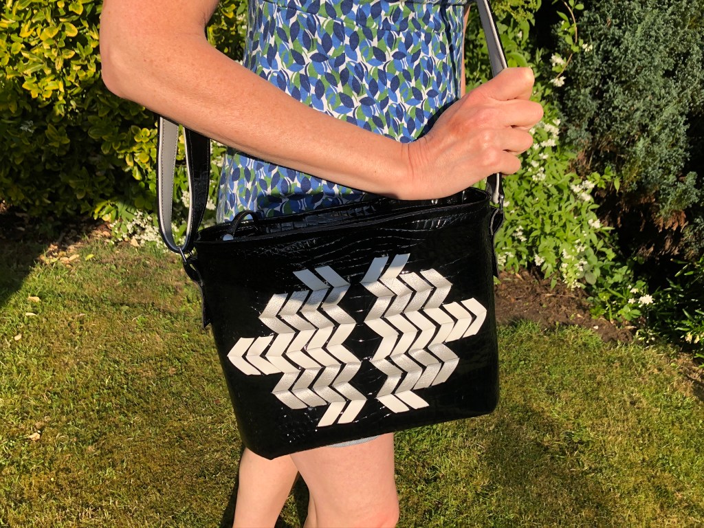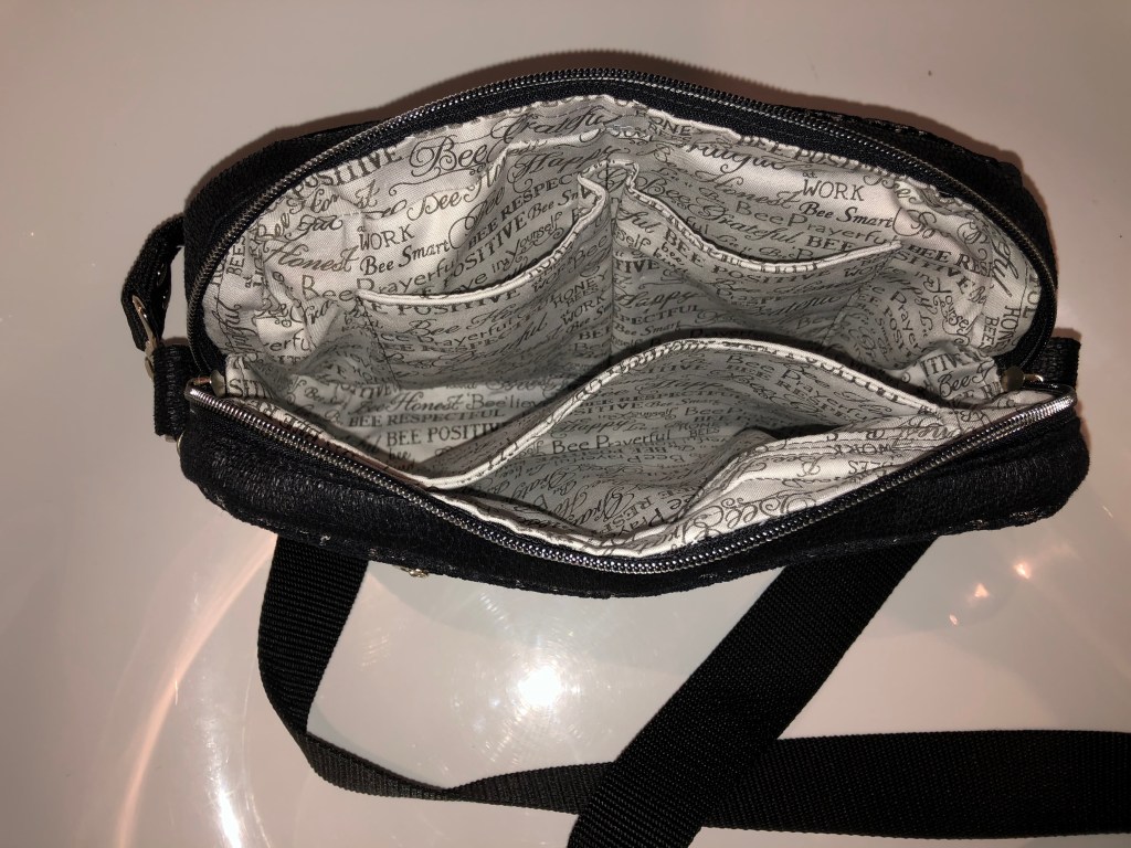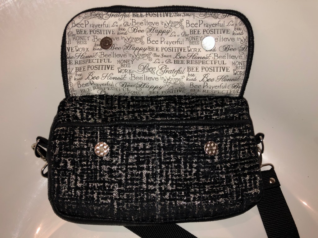 This one is in black and silver chenille, with distressed black faux leather accents. There is an adjustable and removable webbing strap that takes the bag from cross-body to over-the-shoulder to clutch. There are even treble clef zip pulls for music lovers! The lining is grey cotton with a “Bee Positivity” print. £40.00 plus P&P.