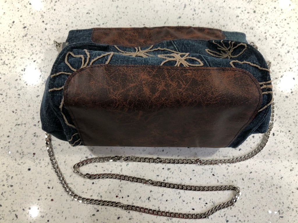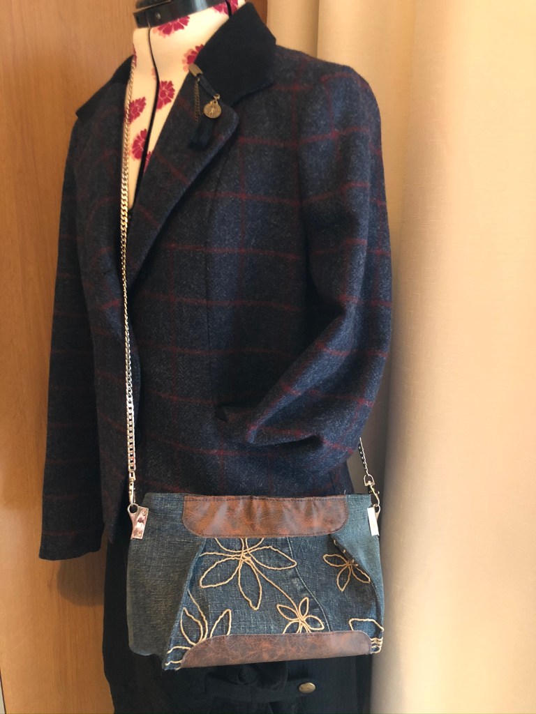 The Goldfinch comes in two sizes, Clutch (with a detachable chain shoulder strap) and Handbag (with two shoulder length handles). Either way, they are roomy, and have internal zip and slip pockets. The handbag fastens with a top zip, and the clutch with a magnetic snap. This handbag’s exterior is in blue faux leather, and the clutch is in embroidered denim with brown faux leather accents. Both are lined in cotton. Handbag £55.00, Clutch £35.00 each plus P&P.