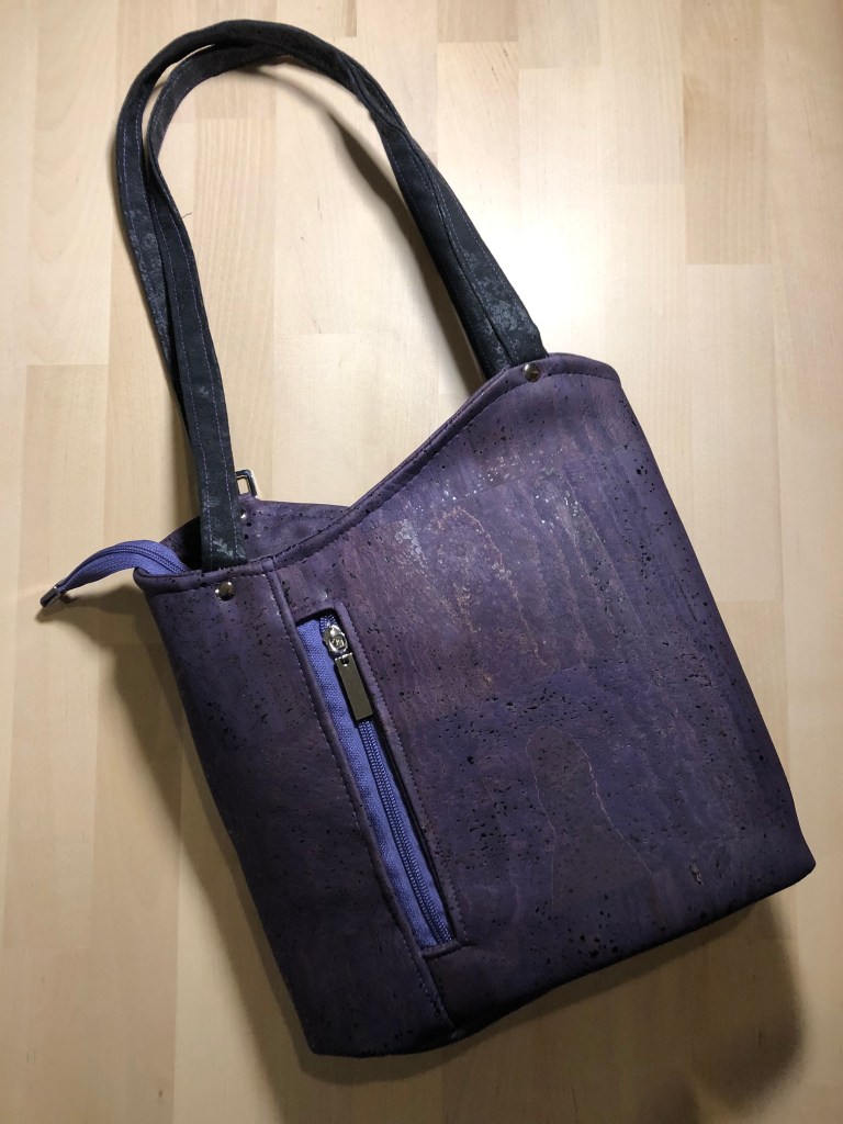 “Stargazer”: Rennie Mackintosh capacious handbag (15” W x 10.5” H x 4.5” D), fully lined in teal satin with natural cork trim. Two carrying handles and detachable cross-body strap. Large slip pockets on front and rear exterior, interior zippered and slip pockets. – SOLD