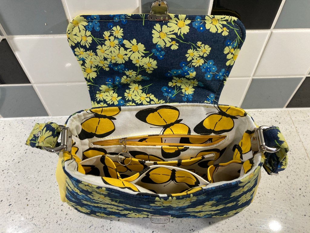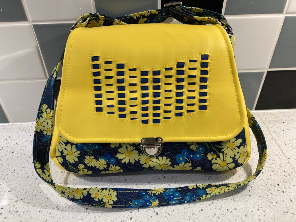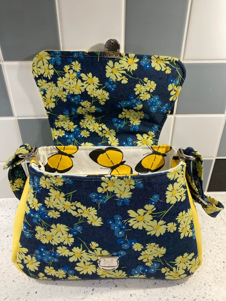 This “Bag With No Name” speaks of spring and the promise of summer with it’s cheery primrose print on indigo denim and contrast yellow flap. The front flap is in faux leather and also features a woven design in blue.