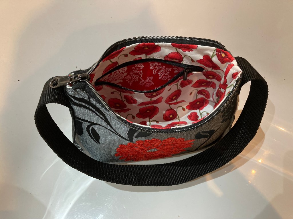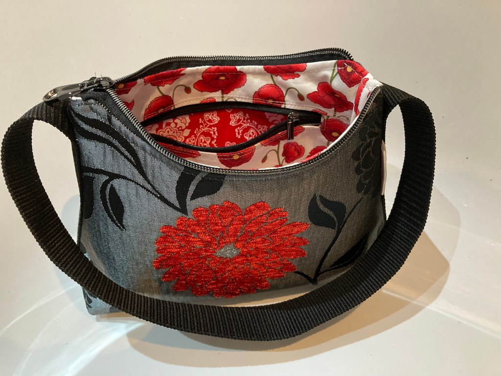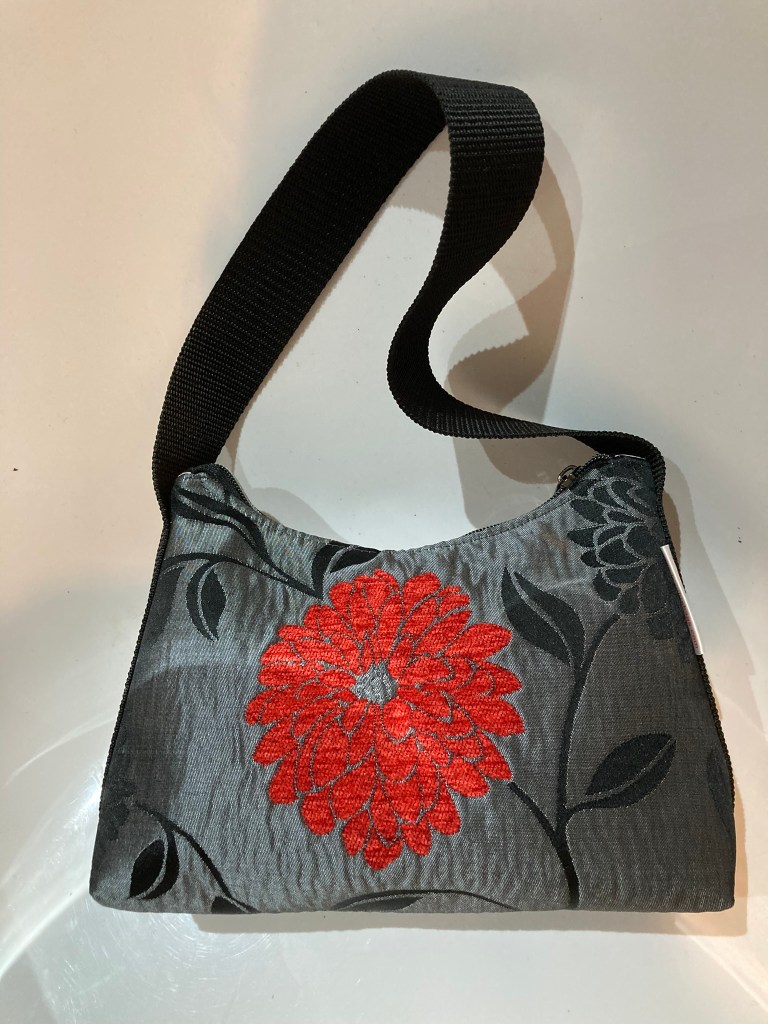 The grey is in a sumptuous fabric, featuring a chenille large red flower on the front and back. It has a black strap and a poppy lining.