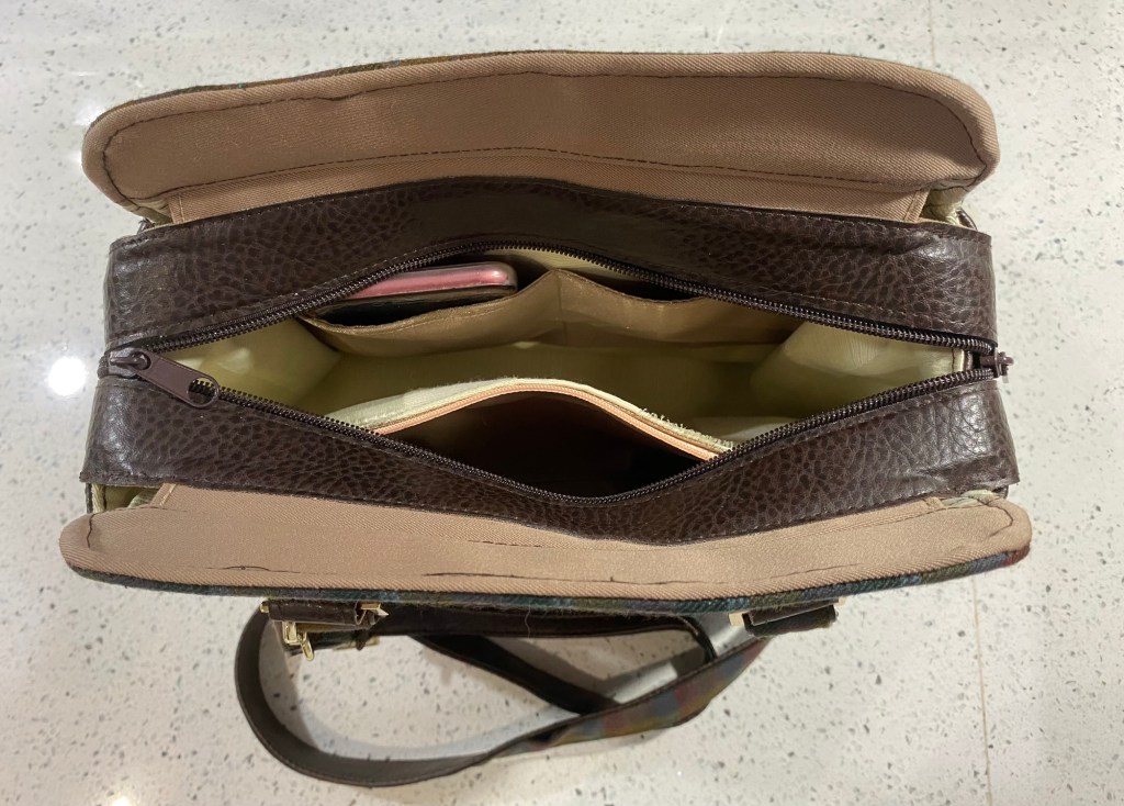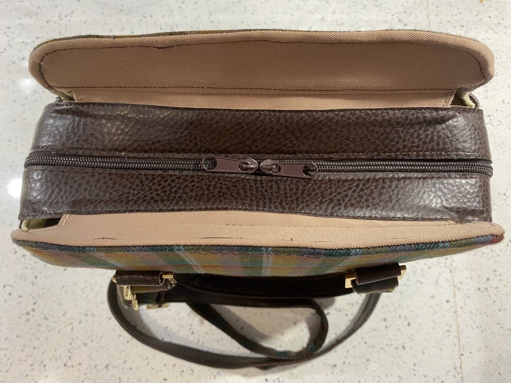 The brown version has a fine wool exterior in contrasting plain and check. The main lining is a textured cream home-dec fabric, with gold poly-satin linings to the pockets – SOLD