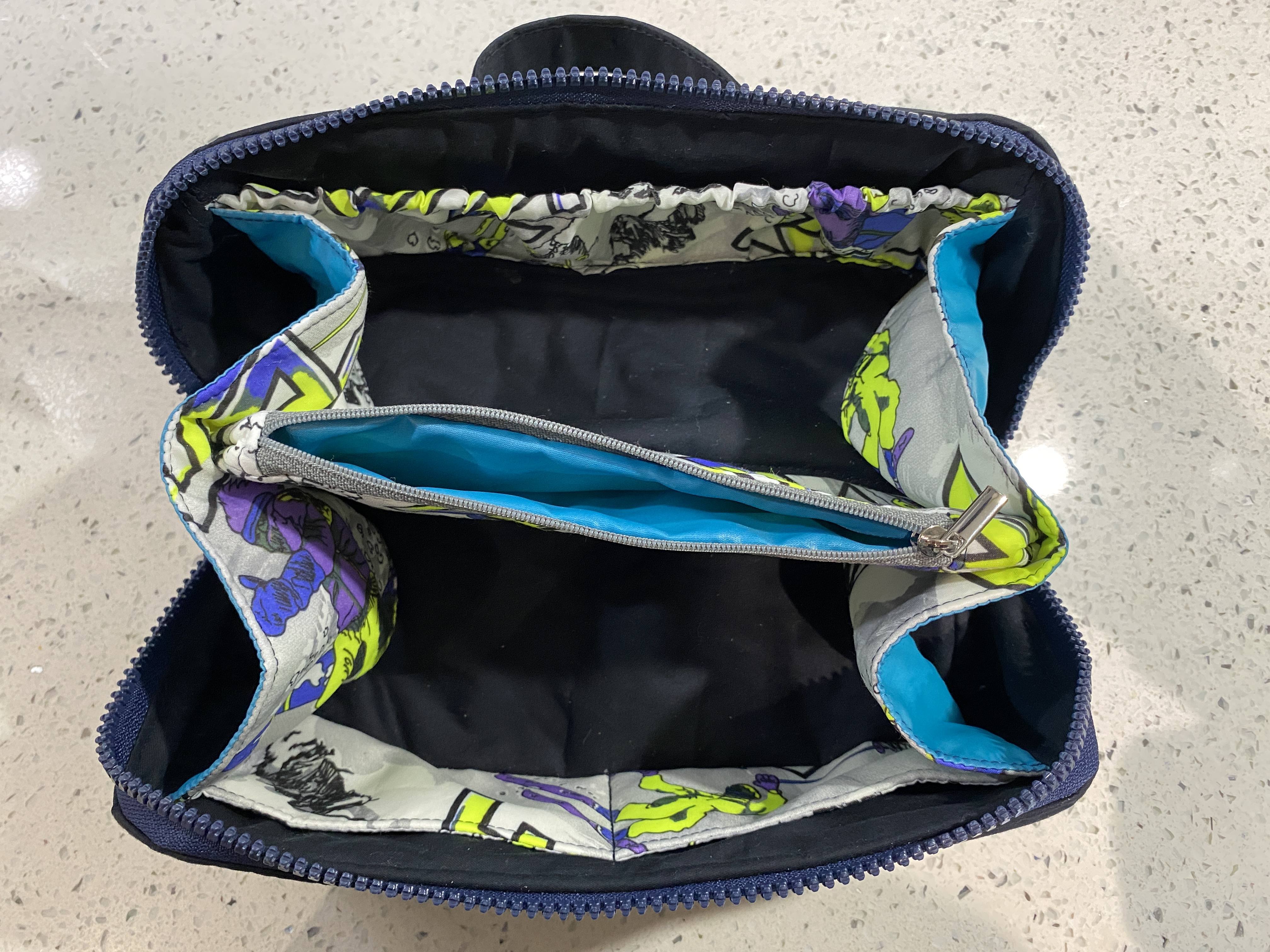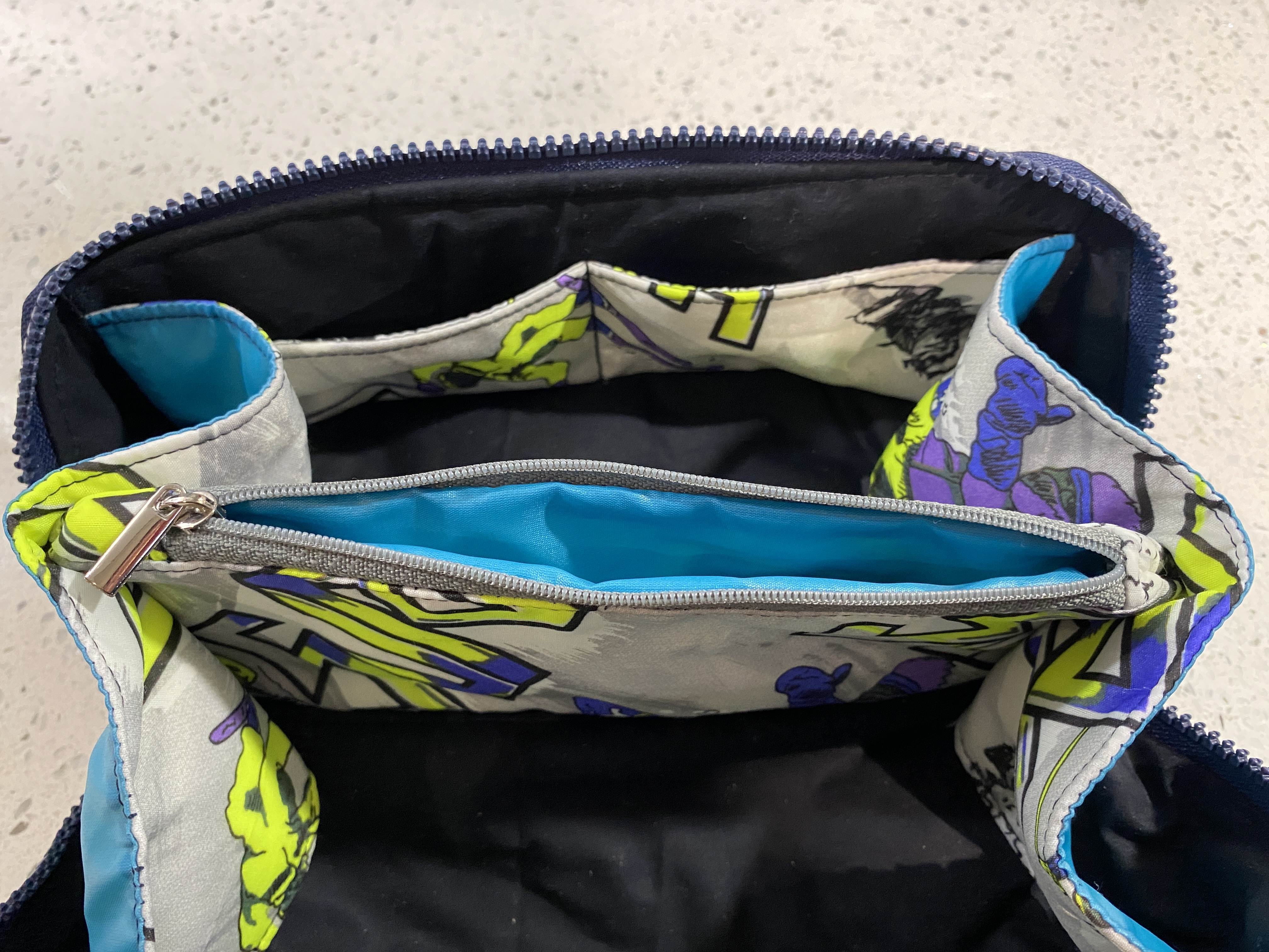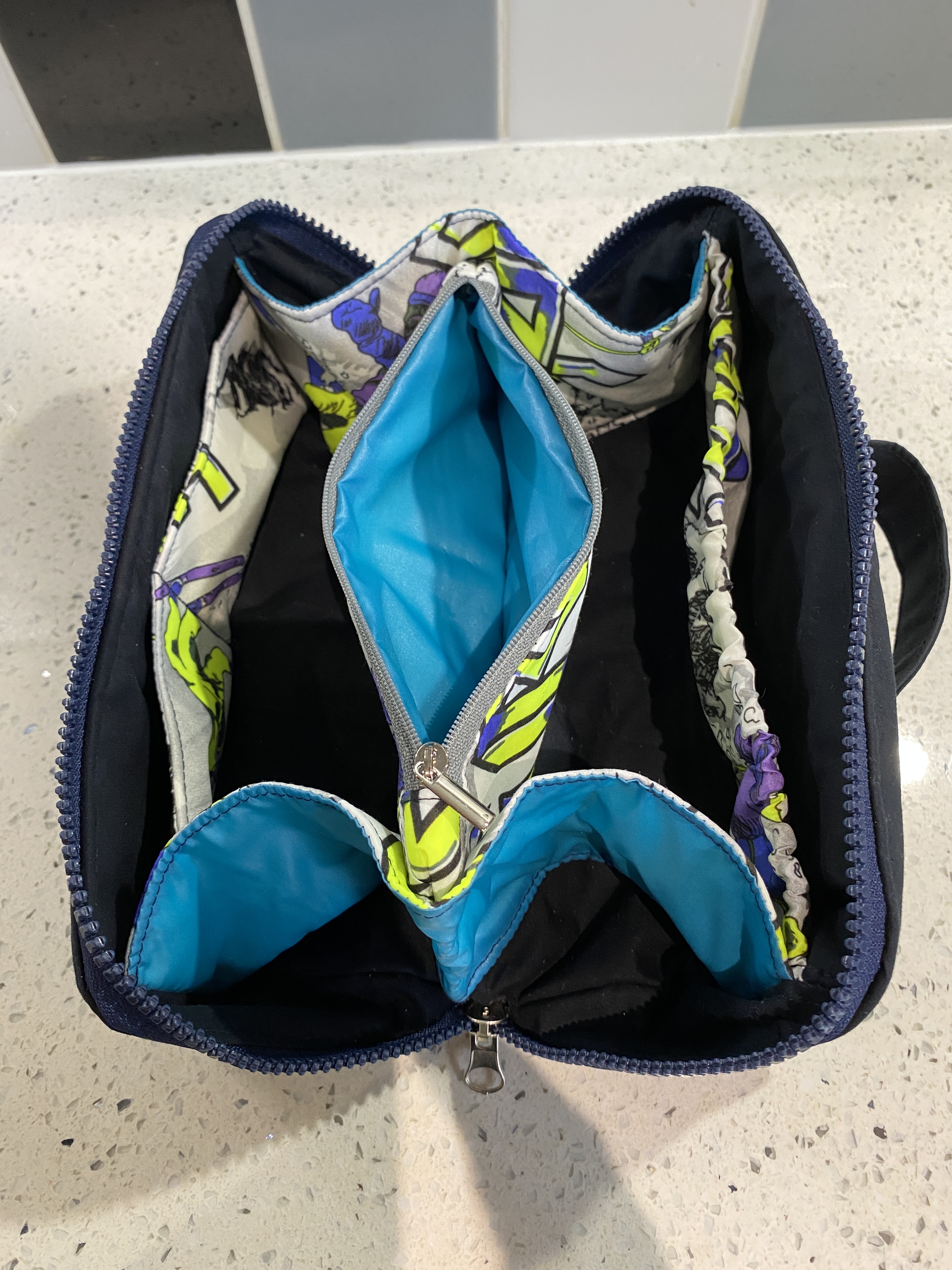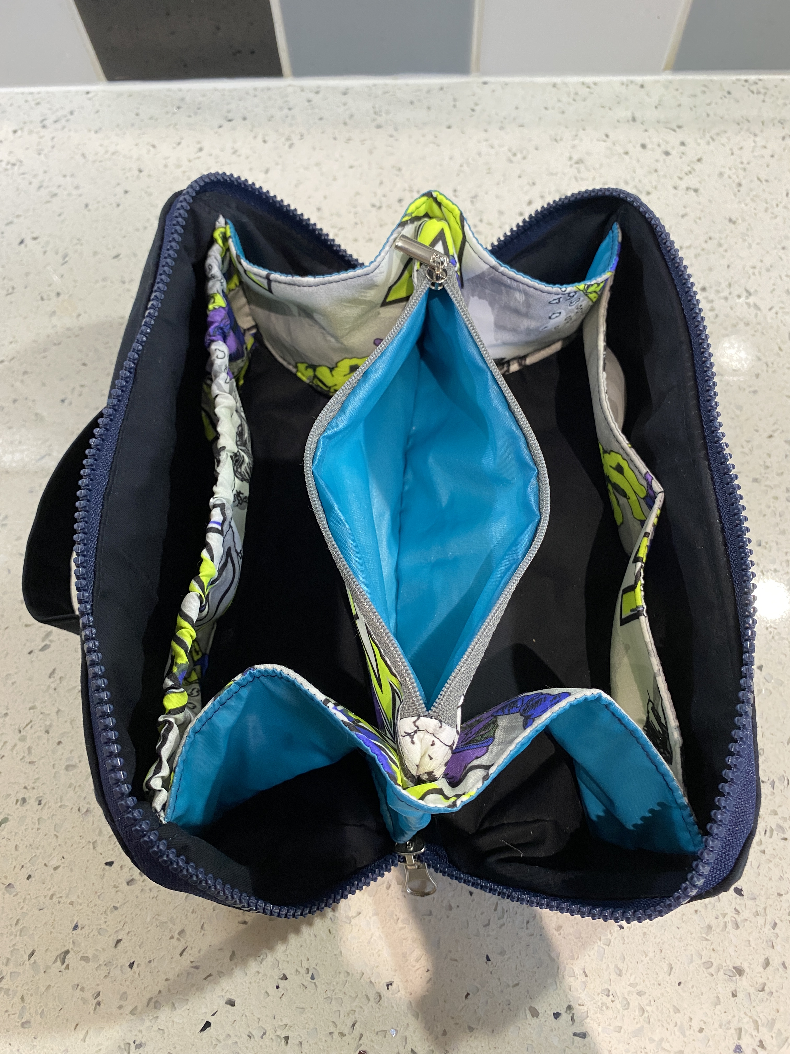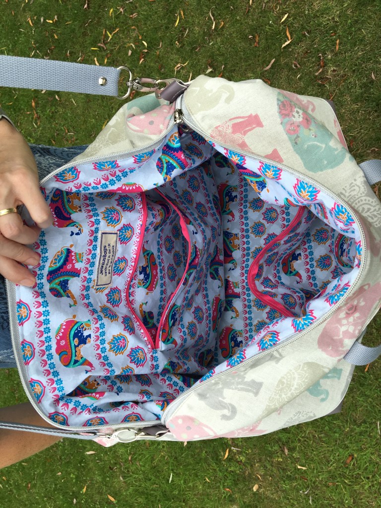 This version was custom made for a client and features a funky elephant print canvas exterior with grey faux leather base reinforcement. The lining is an even more funky ethnic elephant print. The top zip is sparkly silver tape with silver teeth, and the interior zips are pink with silver coloured pulls.