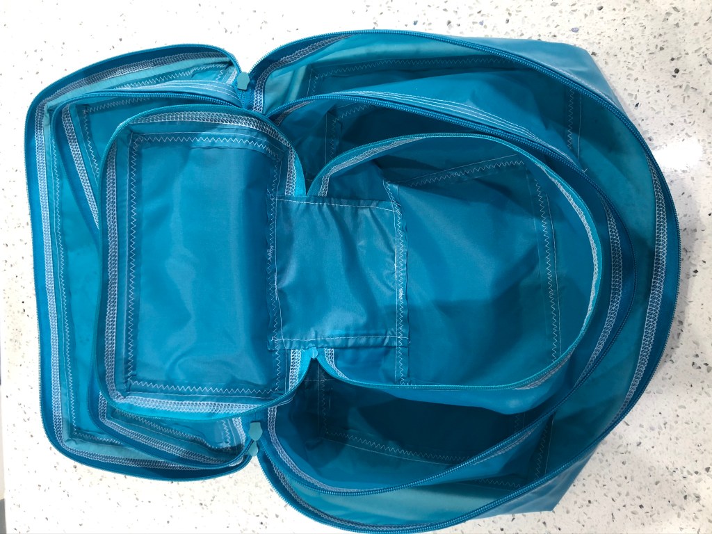 The Traveller has many, many pockets for all your travel essentials – passport, tickets, boarding passes, ereader, ear buds, phone, face mask and hand sanitiser. There’s also a large central compartment for everything else!
