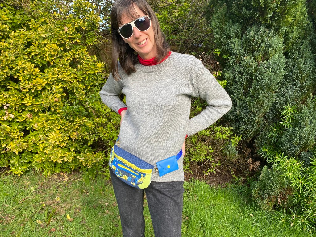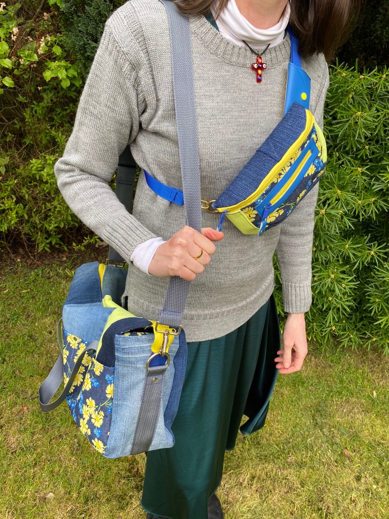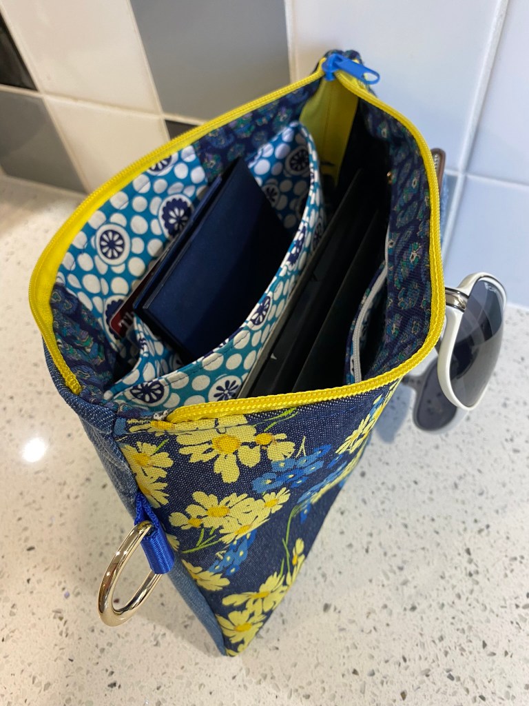 This one is in black and silver chenille, with distressed black faux leather accents. There is an adjustable and removable webbing strap that takes the bag from cross-body to over-the-shoulder to clutch. There are even treble clef zip pulls for music lovers! The lining is grey cotton with a “Bee Positivity” print. £40.00 plus P&P.
