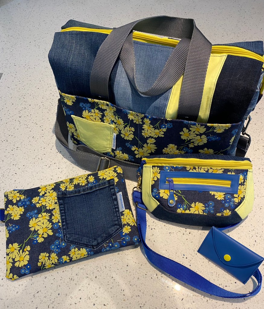 This super-cool luggage set comprises the Weekender Escape Pod, the Travel Clutch and the Clamshell Sling. These cheery bags are all made in repurposed blue, lemon and floral denim, with cotton linings. The straps are nylon webbing, and all close securely with zip fasteners.