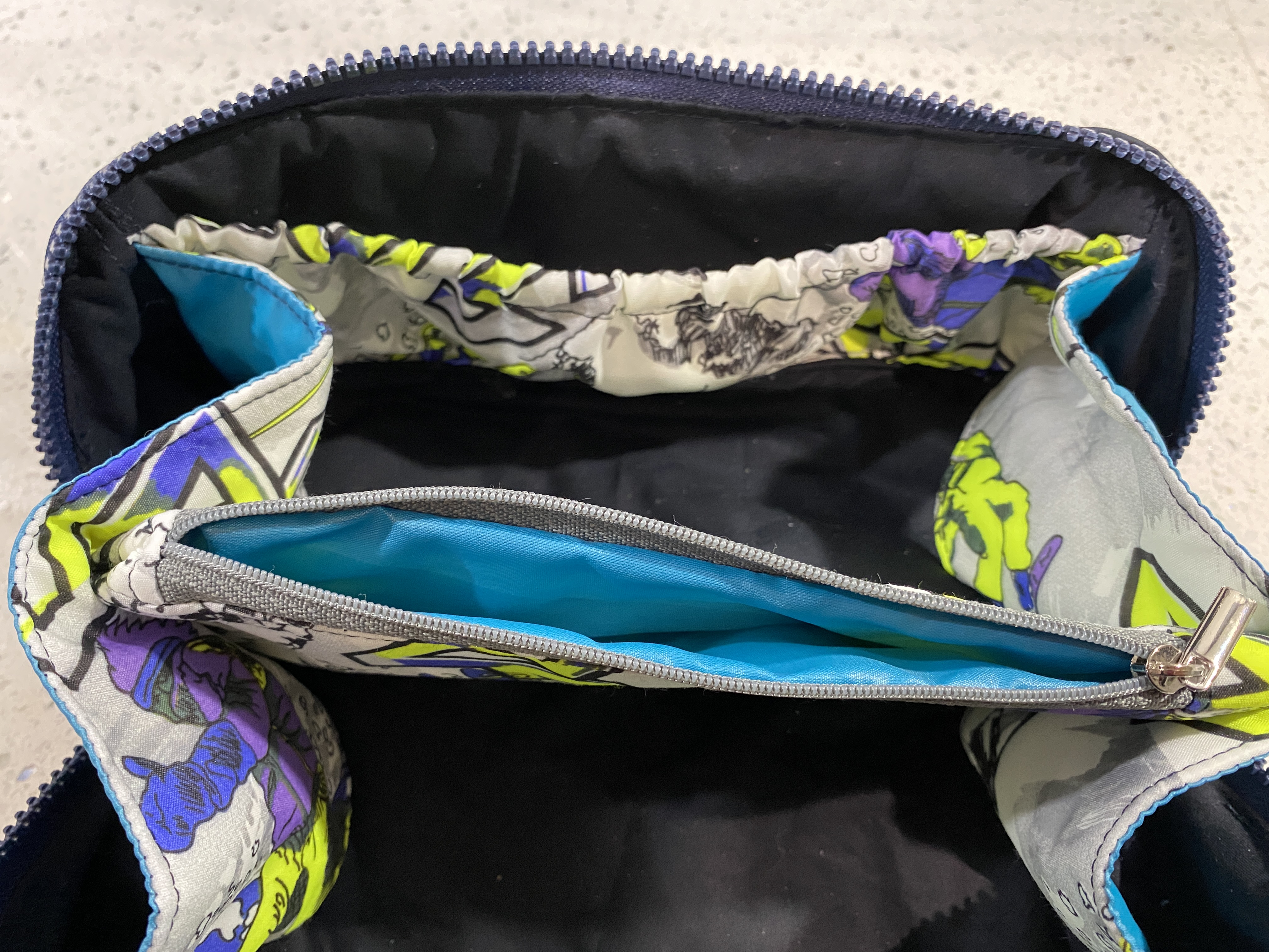 The outside of one of these is in 100% cotton printed with a world map and faux leather accents, and the lining shows a map of the London Underground printed in 100% cotton (SOLD). The other is purple, with the outside is in 100% cotton canvas and faux leather accents, and the lining is in toning 100% cotton (available).
