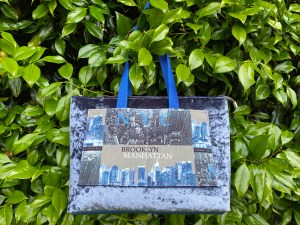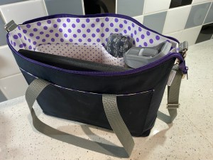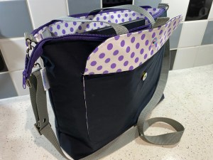 The silver-grey is made of padded crushed velvet with a “Brooklyn” feature panel and blue faux leather accents, It has a purple poplin lining with white and lilac cotton contrast pockets. The navy is in water-resistance canvas with a white and lilac cotton lining. Both have over the shoulder handles, and the navy also has an adjustable and removable crossbody strap. £35 each plus P&P.