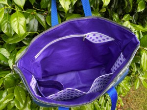 The blue/pink version exterior is in indigo denim with a pink and blue floral print, and pink and white striped cotton canvas. The main lining is purple poly-satin with a contrast floral blue fabric inside the pockets.